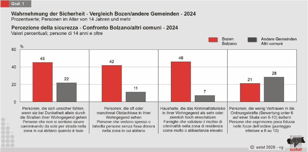 A fine 2025 erano stati pubblicati i primi dati del discusso Barometro della sicurezza altoatesina, l’indagine condotta dalla rcm solutions srl su incarico del Dipartimento Edilizia abitativa, Sicurezza e Prevenzione della violenza. Dall’analisi sulle paure degli altoatesini rispetto alla sicurezza, era emerso come il 59% delle persone intervistate indica „l'immigrazione eccessiva“ tra le cause principali della criminalità, il 41% ritiene che siano „le pene troppo lievi“ e il 34% „i problemi economici“.