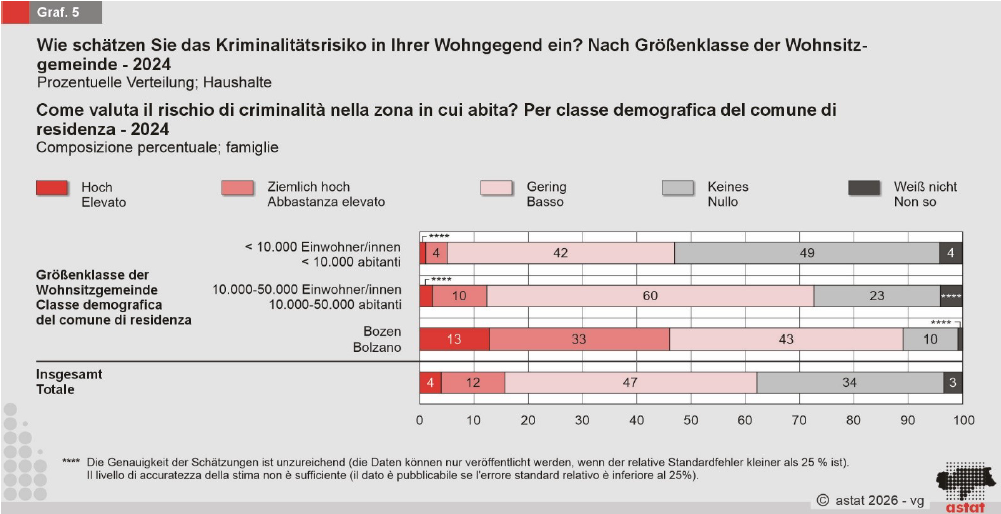 A sentirsi più insicuri sono i cittadini del capoluogo, che registra il livello più elevato di disagio soggettivo: a Bolzano quasi la metà (45%) della cittadinanza si sente poco o per niente sicuro. Al contrario, nei comuni più piccoli, sotto i 10.000 abitanti, la quota di chi si sente insicuro è pari al 17% e nei comuni di media dimensione (10.000-50.000 abitanti), il livello di sicurezza percepita è intermedio (57% si sente sicuro, 33% insicuro).