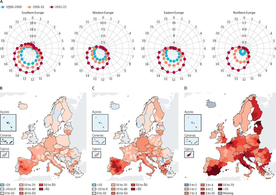 Zunahme und Ausdehnung von Hitzewellen in Europa zwischen 1990 und 2022: Die Kreisdiagramme (oben) zeigen den Jahresverlauf: Die Zahlen 1 bis 23 entsprechen den Monaten (1 = Jan, 23 = Dezember) die farbigen Linien den Jahrzehnten. Je weiter der Kreis nach außen reicht, desto häufiger traten Hitzewellen auf – sie beginnen früher im Jahr und dauern länger an. Die Karten (unten) verdeutlichen die räumliche Verbreitung der Hitzeexposition: Besonders stark betroffen sind Süd- und Mitteleuropa, wo die Zahl der Hitzetage in den vergangenen 30 Jahren drastisch zugenommen hat. Foto: The Lancet -