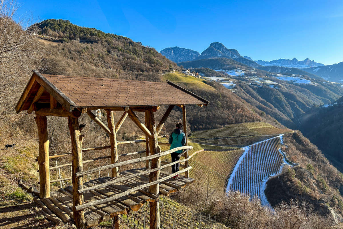 Am Eingang des Tiersertales liegt auf einer Geländeschulter am Fuß des Schlernmassivs die Streusiedlung Völser Aicha. Die Südausrichtung ermöglicht noch Weinbau, im Herbst ist die Gegend von Törggelebegeisterten vielbesucht, jetzt, in der kühlen Jahreszeit, sind wir fast allein auf den Wegen und Steigen in dieser abwechslungsreichen und geschichtsträchtigen Landschaft unterwegs. Von den vielen Einkehrmöglichkeiten längs des Weges haben die meisten Winterruhe, zur Vorsicht sollte etwas Proviant in den Rucksack gepackt werden. Auf unserem Rundweg sind wir die meiste Zeit auf der Trasse der Oachner Höfeweges unterwegs, Oacha sagen die Einheimischen zu Völser Aicha.
