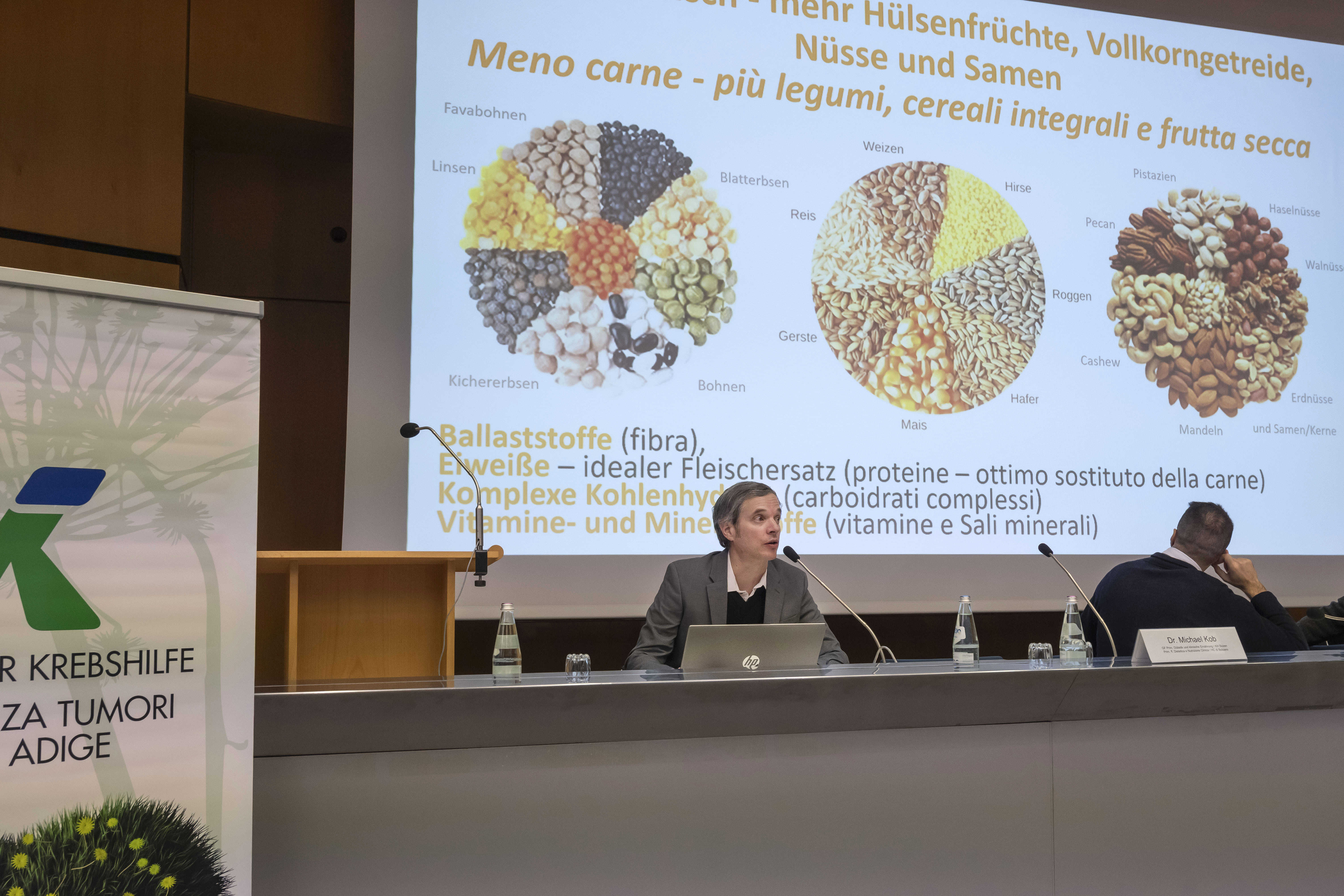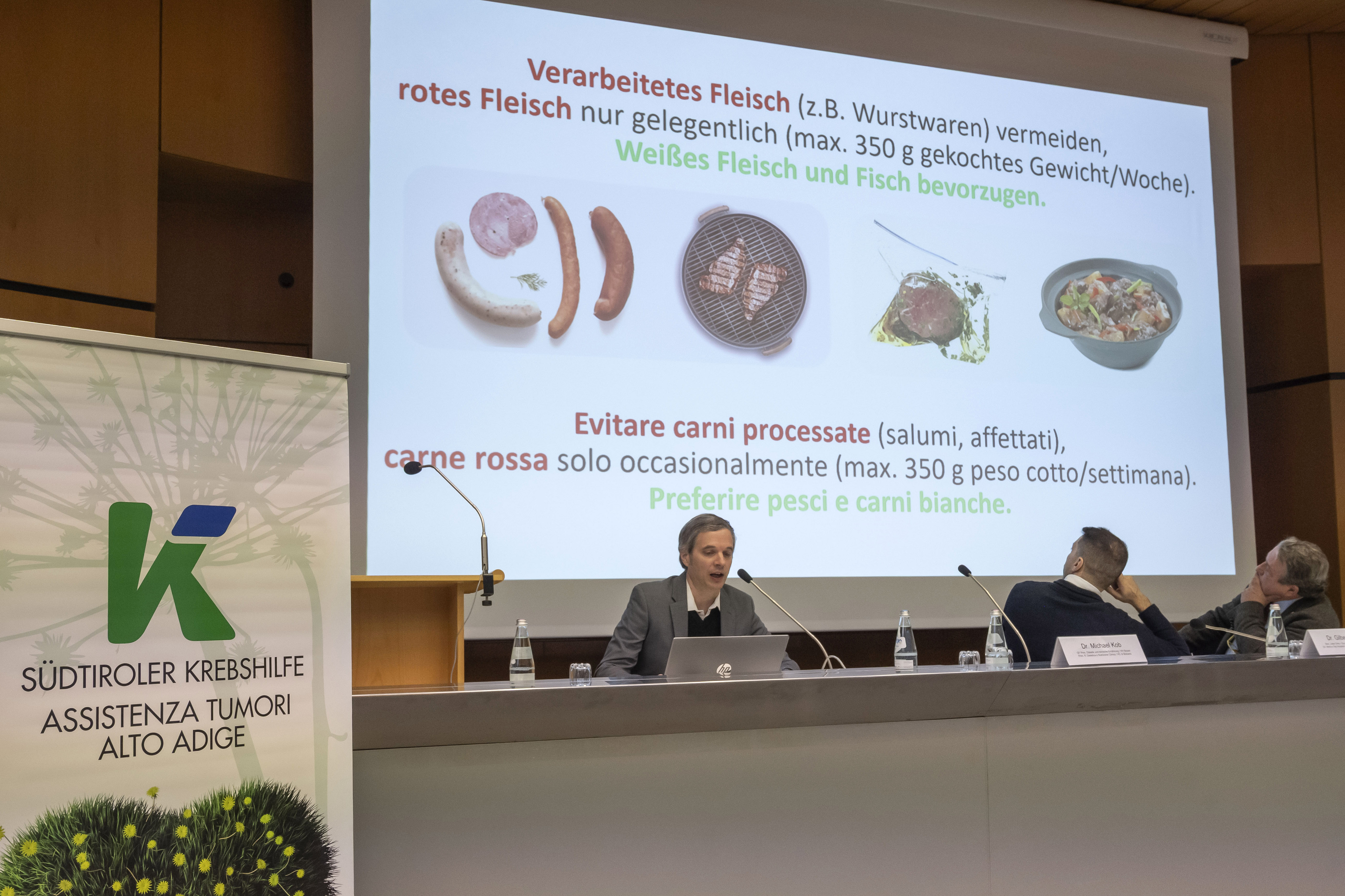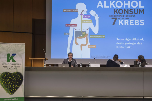 „Auch zum Alkohol, der bis vor wenigen Jahren in geringen Mengen sogar als gesund dargestellt wurde, wissen wir heute“, so Referent Michael Kob vom Dienst für Diätetik und klinische Ernährung am Krankenhaus Bozen, „dass es keine minimale Menge gibt, die ohne Risiko ist.“ Alkohol stellt somit ein relevantes Krebsrisiko dar: Bereits sein Konsum erhöht – abhängig von der konsumierten Menge – das Risiko für mindestens sieben Krebsarten, darunter Brust-, Leber-, Speiseröhren- und Dickdarmkrebs.