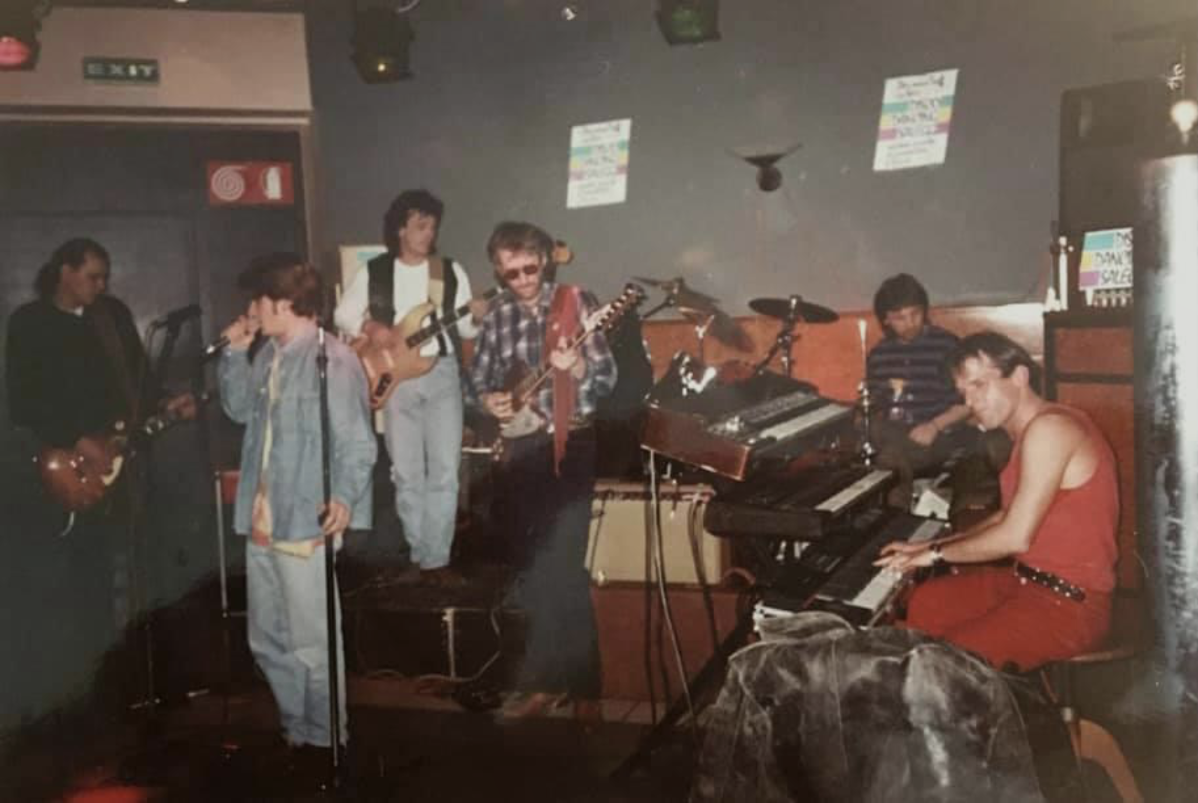 Route 66, die erste gemeinsame Band von Andy Gozzi und Poldo 1992, auf die dann Four Roses folgen sollte (v.l.n.r.): Andy Gozzi (Gitarre), Helmuth Holzinger (Stimme), Walter Kusstatscher (Bass), Werner Bauhofer (Gitarre), Arnold „Poldo“ Obwexer (Schlagzeug) und Stefan Müller (Keyboards). Foto: Archiv: Andy Gozzi -