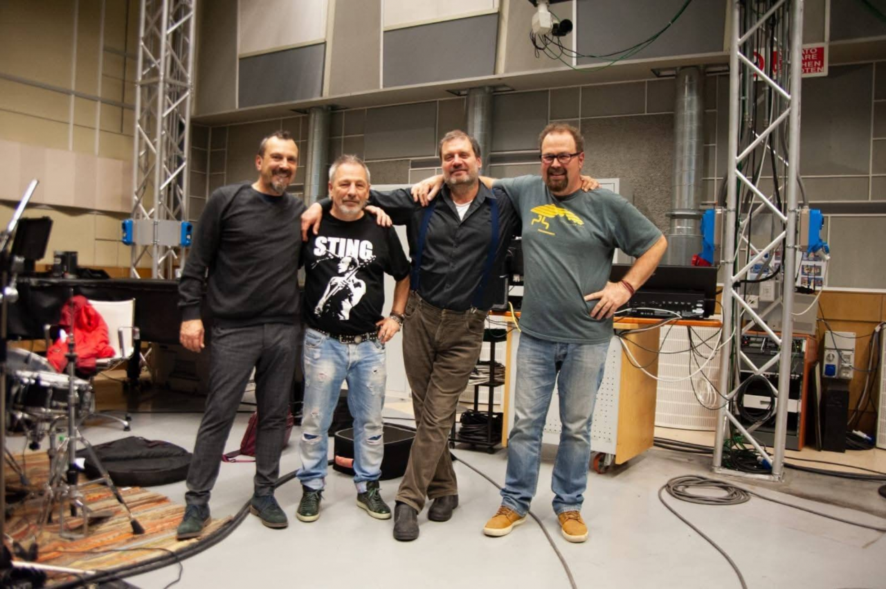 Die Band, in der Arnold „Poldo“ Obwexer die letzten Jahren gespielt hat (v.l.n.r.): Walter Kusstatscher (Gitarre), Arnold „Poldo” Obwexer (Schlagzeug), Armin Gatterer (Bass) und Andreas Ladurner (Gitarre) nach der Session im Auditorium der RAI Südtirol am Donnerstag, 28. November 2019. Foto: Roland Leitner -