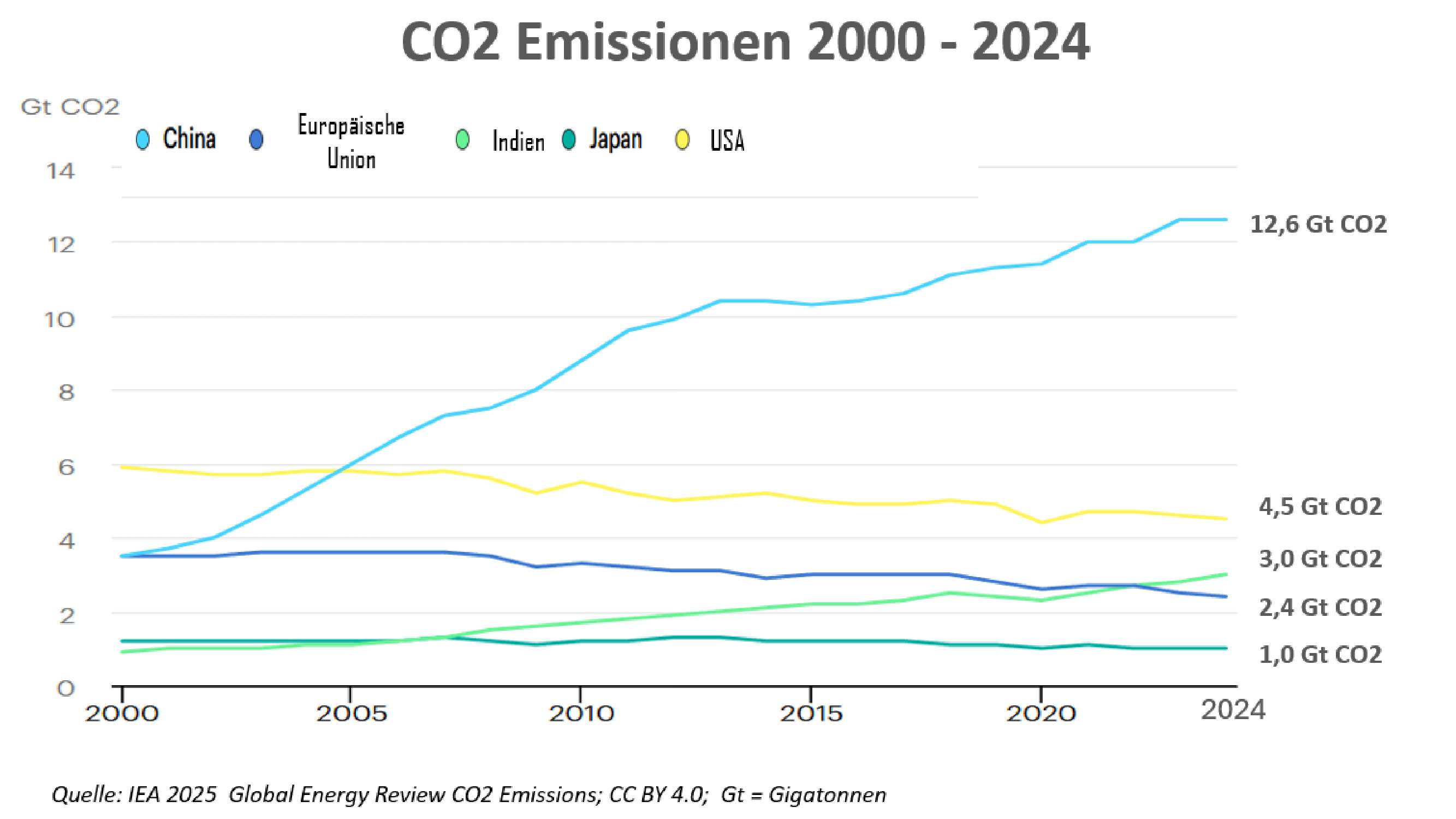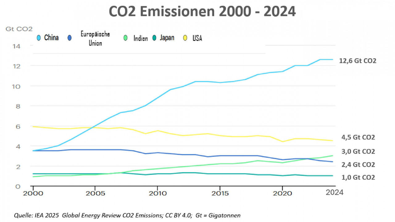 China, der weltweit größte Treibhausgasemittent, verzeichnet seit 2024 eine Stabilisierung der Emissionen, maßgeblich verursacht durch den Ausbau erneuerbarer Energien. 2/