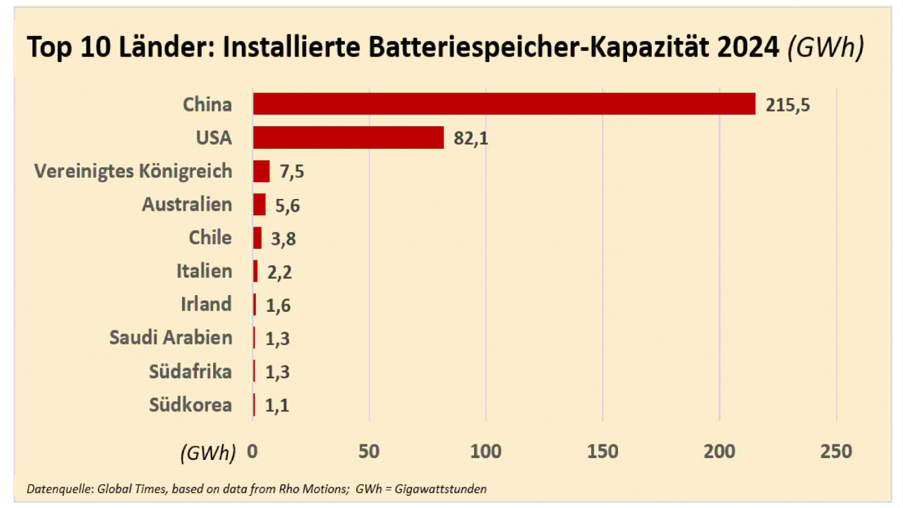 Im Jahr 2024 verfügte China über eine installierte Batteriespeicher-Kapazität von 215,5 GWh, das ist mehr als doppelt so viel wie die nächsten neun Länder zusammen. An zweiter Stelle folgen die USA mit 82,1 GWh installierter Kapazität vor dem Vereinigten Königreich mit lediglich 7,5 GWh. Laut Medienberichten ist die Batteriespeicher-Kapazität auch im Jahr 2025 in China, aber auch in anderen Ländern weiter stark gestiegen.