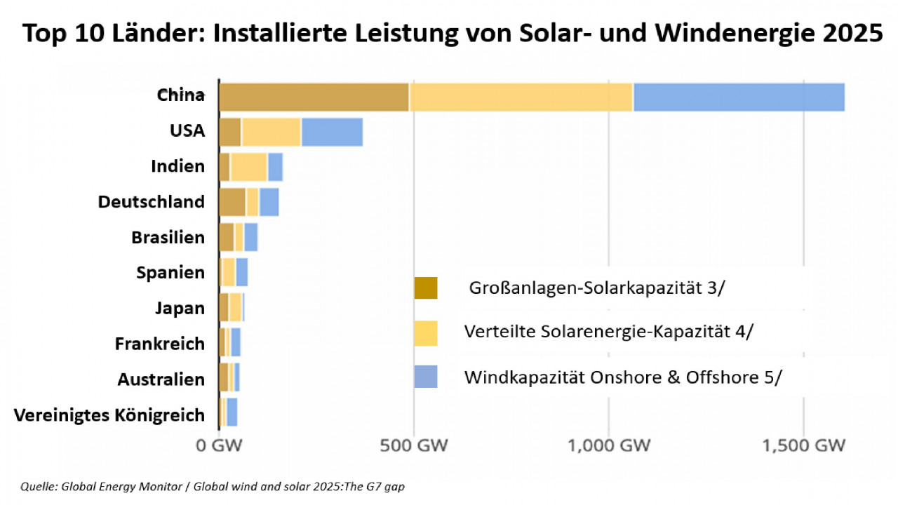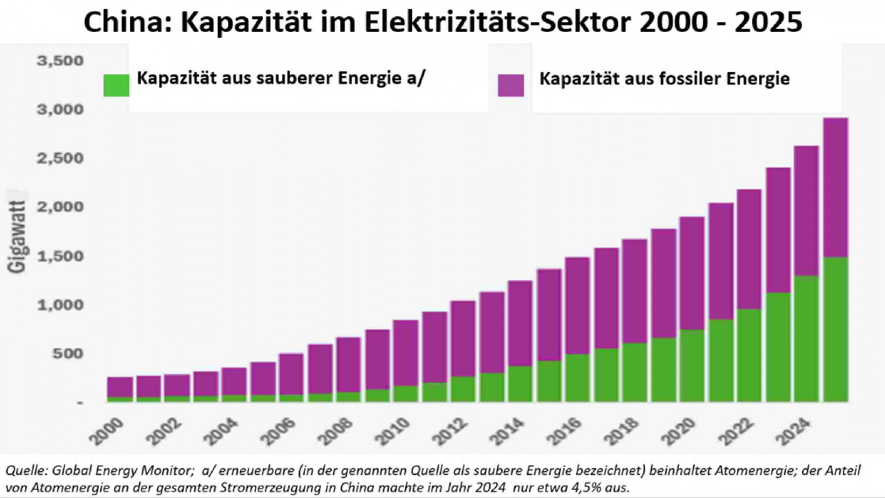 Mit einer Solar- und Windkraft-Kapazität von über 1,5 Gigawatt im Jahre 2025 ist China mit großem Abstand der weltweite Spitzenreiter. Im Jahr 2025 überschritt China eine entscheidende Schwelle, indem erstmals mehr Stromkapazität aus erneuerbarer Energie genutzt wurde als aus fossilen Energien. Der starke Anstieg der Solar- und Wind-Kapazität ermöglichte es China auch, den Anteil der Kohleverstromung am gesamten Energiemix von 64 % im Jahr 2015 auf ein Rekordtief von 42,7 % im vergangenen Jahr zu senken. 2/