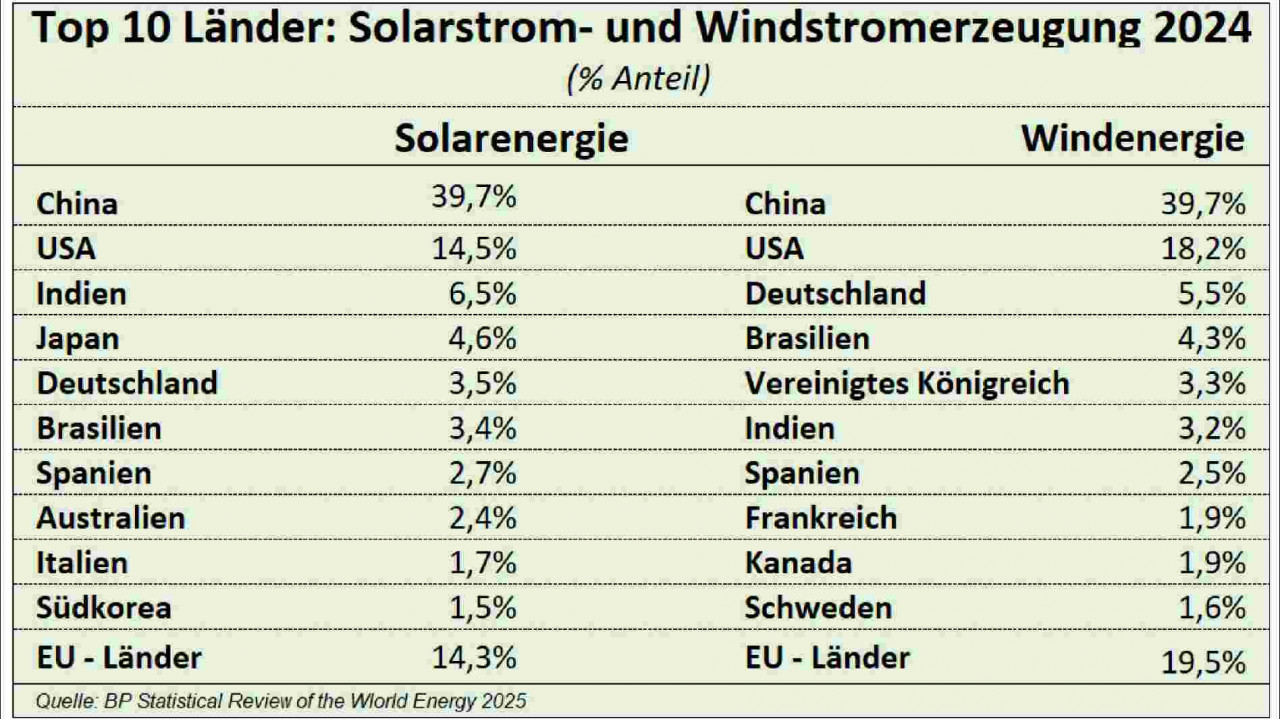 Chinas Anteil an der weltweiten Solarstromerzeugung betrug im Jahre 2024 fast 40%. An zweiter Stelle rangierten die Vereinigten Staaten mit 14,5% vor Indien mit 6,5%. Alle EU-Länder zusammen machten 14,3% aus. Auch bei der weltweiten Windstromerzeugung lag China mit einem Anteil von 39,7% an erster Stelle, gefolgt von den USA mit 18,2% und Deutschland mit 5,5%, während alle EU-Länder zusammen eine Anteil von fast 20% erreichten.