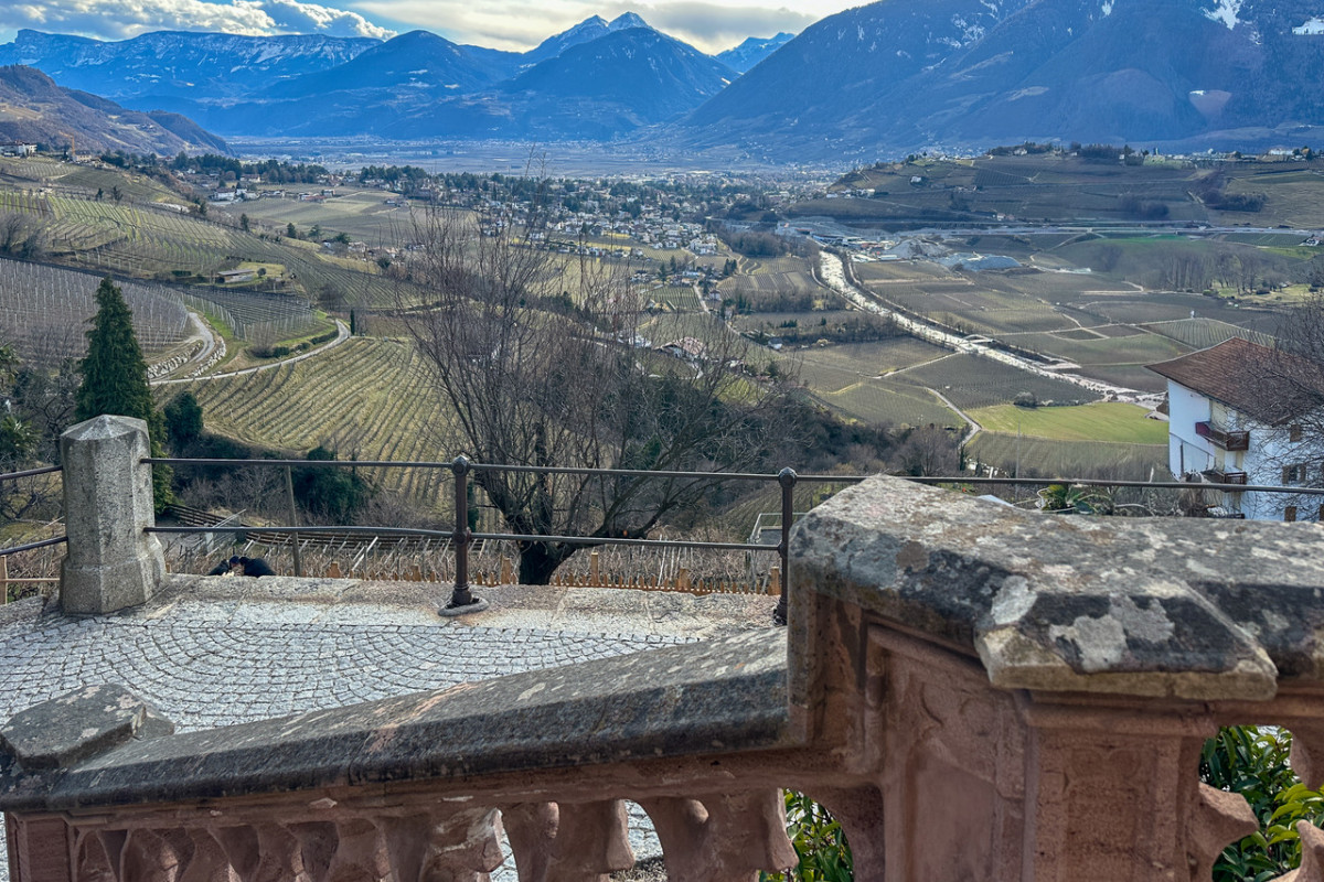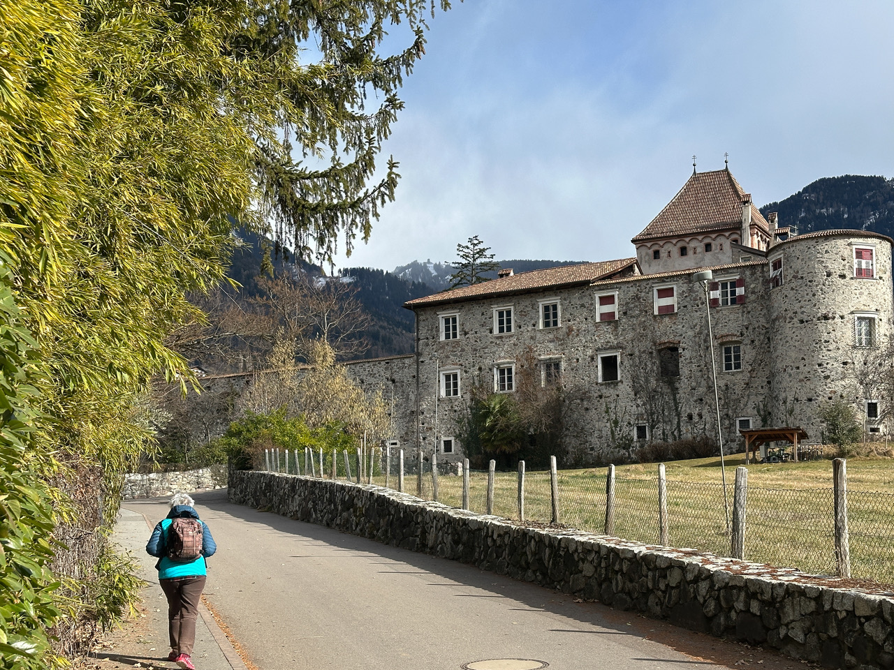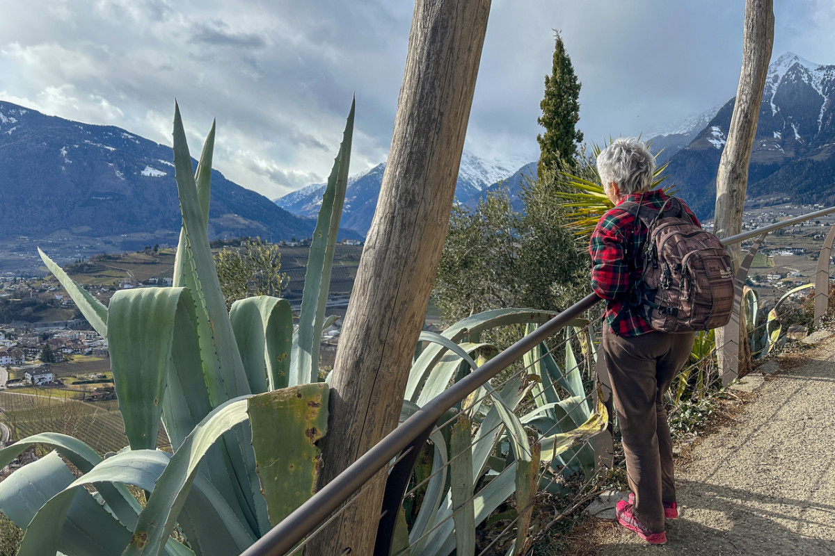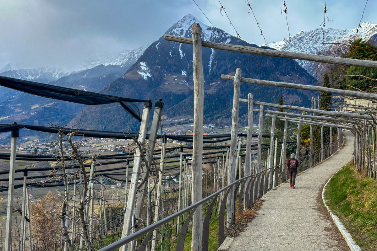 Der Weg verengt sich zu einem Pfad, der in weiten Schleifen durch Mischwald bergab führt und im Tal auf den Waalweg Saltaus-Obermais trifft, der aus dem Passeiertal kommt. Jetzt im Winter führt der Waal kein Wasser, der ebene Begleitsteig schlängelt sich abwechslungsreich durch Wald, Obstwiesen, Weinbergen und stattlichen Bauernhäusern entlang, felsige Stellen werden auf hölzernen Stegen gequert. Wir kommen wieder zum Schloss Planta, treffen dort auf den Aufstiegsweg und sind bald wieder im Stadtzentrum von Meran angelangt.