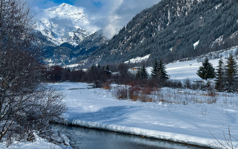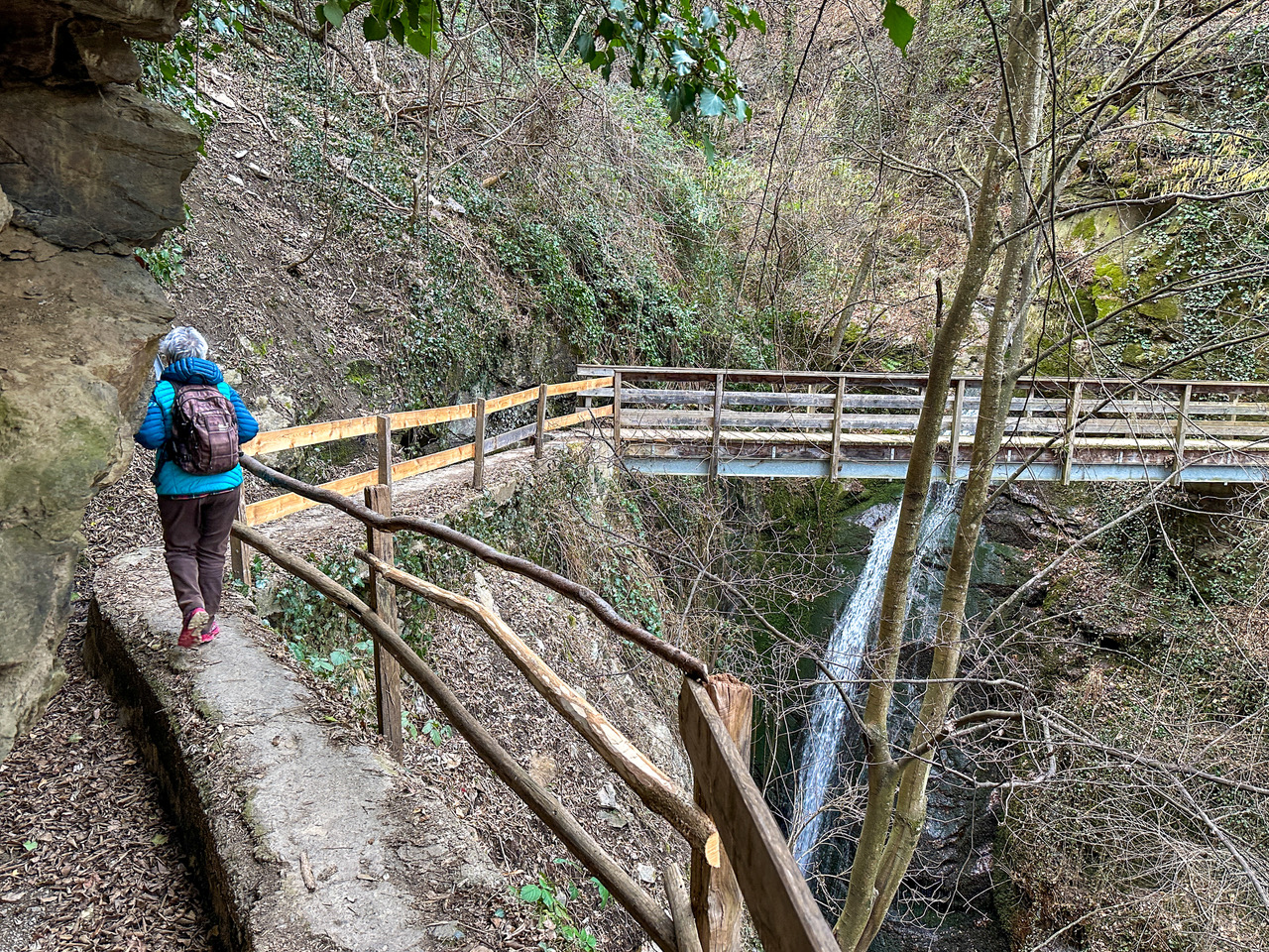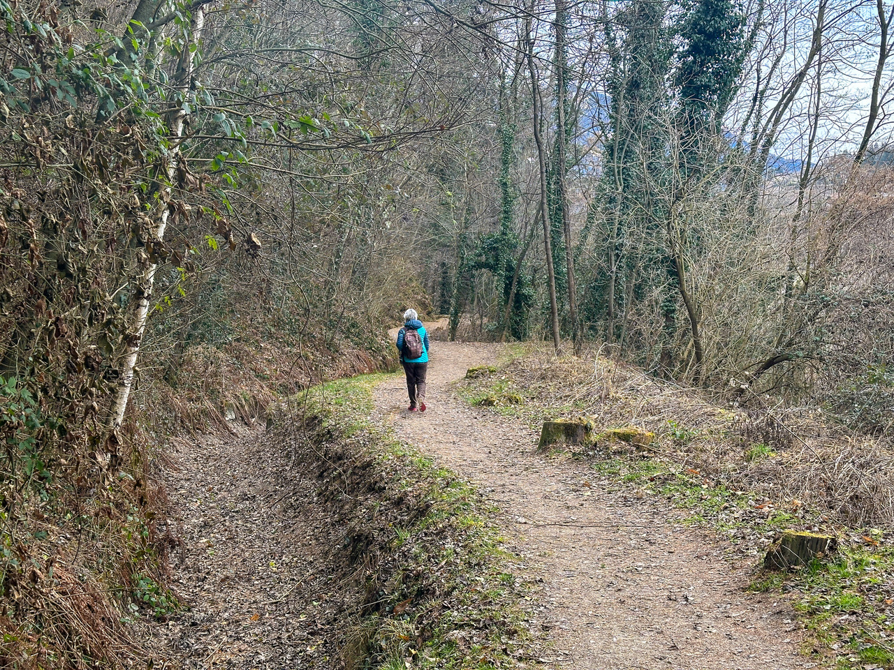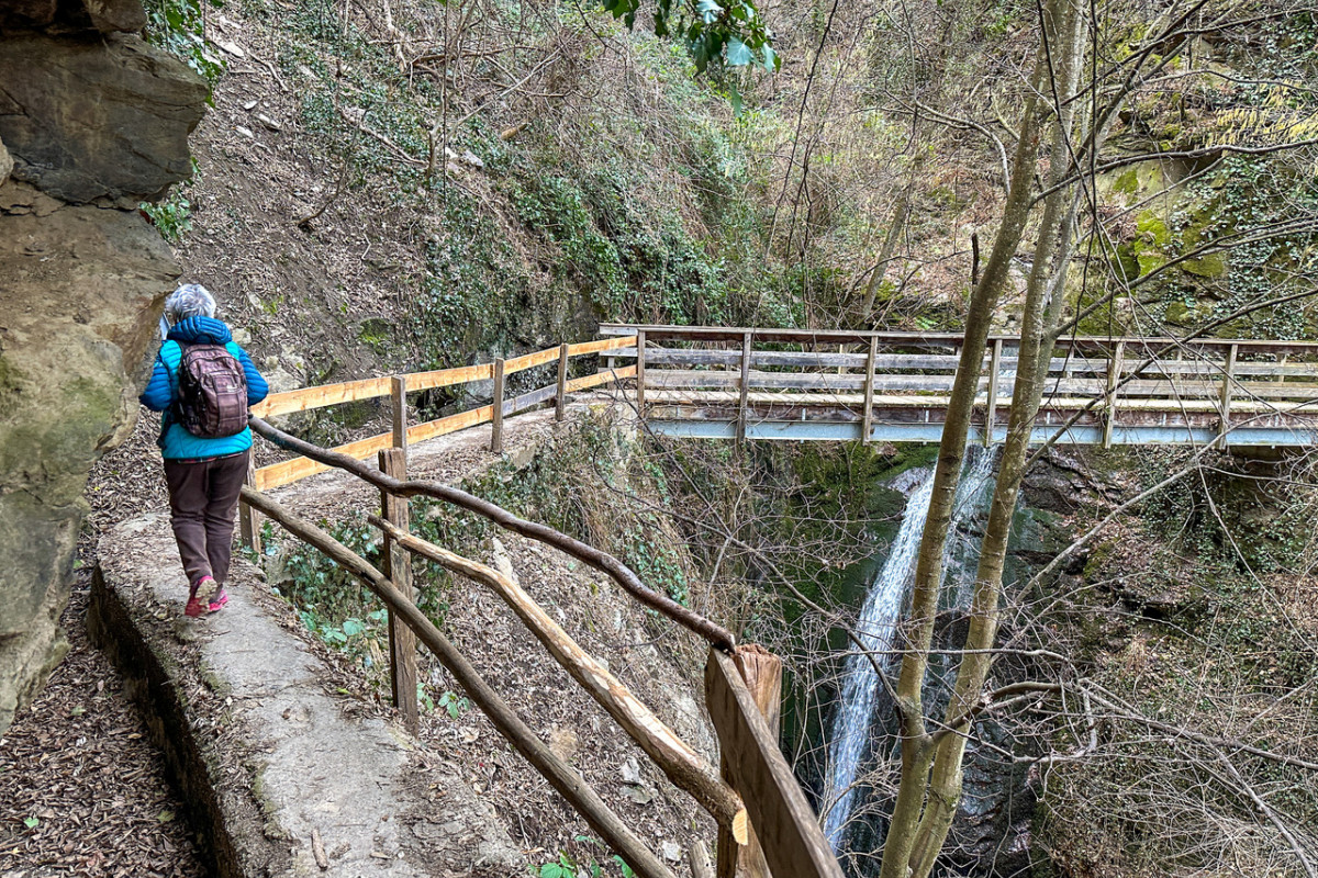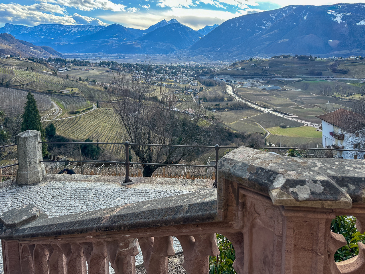 Der Weg verengt sich zu einem Pfad, der in weiten Schleifen durch Mischwald bergab führt und im Tal auf den Waalweg Saltaus-Obermais trifft, der aus dem Passeiertal kommt. Jetzt im Winter führt der Waal kein Wasser, der ebene Begleitsteig schlängelt sich abwechslungsreich durch Wald, Obstwiesen, Weinbergen und stattlichen Bauernhäusern entlang, felsige Stellen werden auf hölzernen Stegen gequert. Wir kommen wieder zum Schloss Planta, treffen dort auf den Aufstiegsweg und sind bald wieder im Stadtzentrum von Meran angelangt.