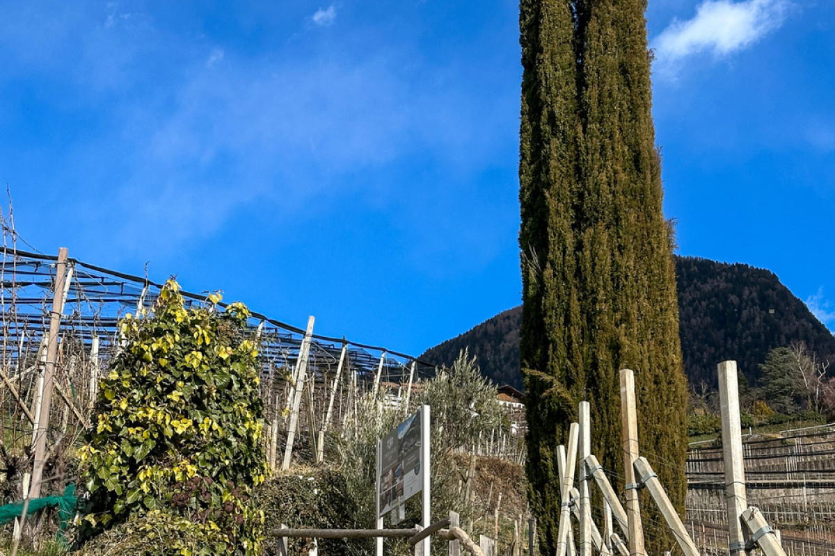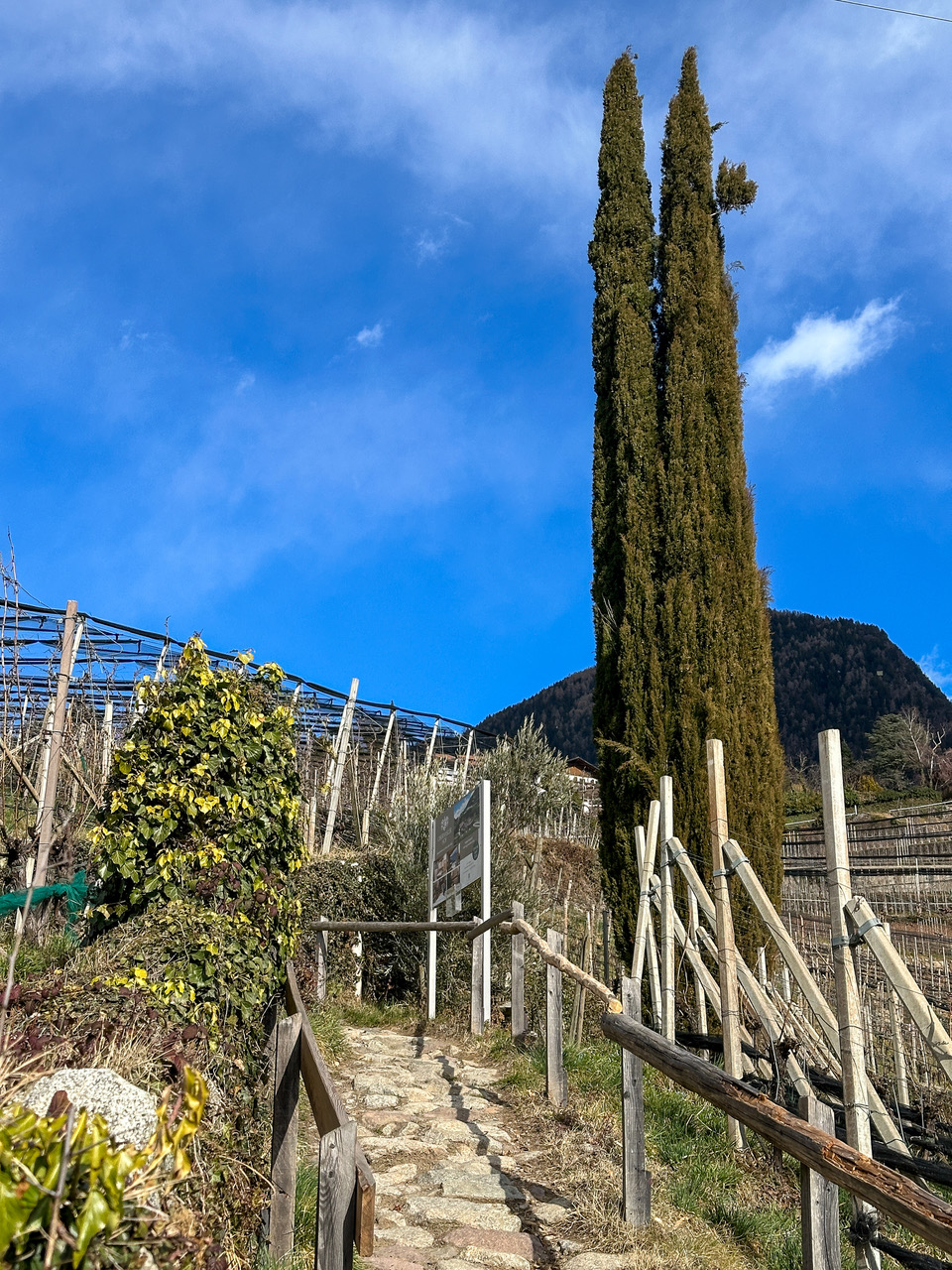 Am sonnigen Hang nordöstlich von Meran liegt Schenna am Fuß des Hausberges Ifinger. Von der Stadt bis zum alten Dorfkern mit Kirchhügel, Dorfplatz und dem alles beherrschenden Schloss Schenna zieht sich ein schöner Wanderweg hin. Dabei queren wir ein Stück vom Zentrum, das Villenviertel von Obermais, Obstanlagen, Weingärten und gehen zuletzt auf einem vorbildlich angelegten Weg in großteils ebener Wanderung, an Weinhöfen und Hotels entlang, auf das Dorf Schenna zu. An sonnigen Wintertagen, wenn die Wege noch nicht von Urlaubsgästen überfüllt sind, ist dieser Ausflug geradezu ein Geheimtipp. Wegen der geringen Höhenlage, Schenna liegt um die 550 m, liegt selten Schnee.