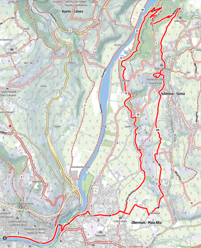 Wir beginnen unsere Wanderung im Stadtzentrum, an der Theatherbrücke, spazieren der Passerpromenade entlang flussaufwärts bis zum Steinernen Steg, überqueren ihn und setzen die Wanderung auf dem Lazagsteig (Nr. 10) fort. Nun gehen wir auf einer Unterführung unter der Passeier-Staatsstraße Nr 44 durch, biegen nach 100 m rechts ab. Wir gehen an der Pizzeria Mösl vorbei in die Schönblickstraße und nun stetig bergauf, zwischen Häusern und Gärten, an der Nordseite von Schloss Planta mit seinen mächtigen Rundtürmen vorbei und gelangen auf Weg 10A.
