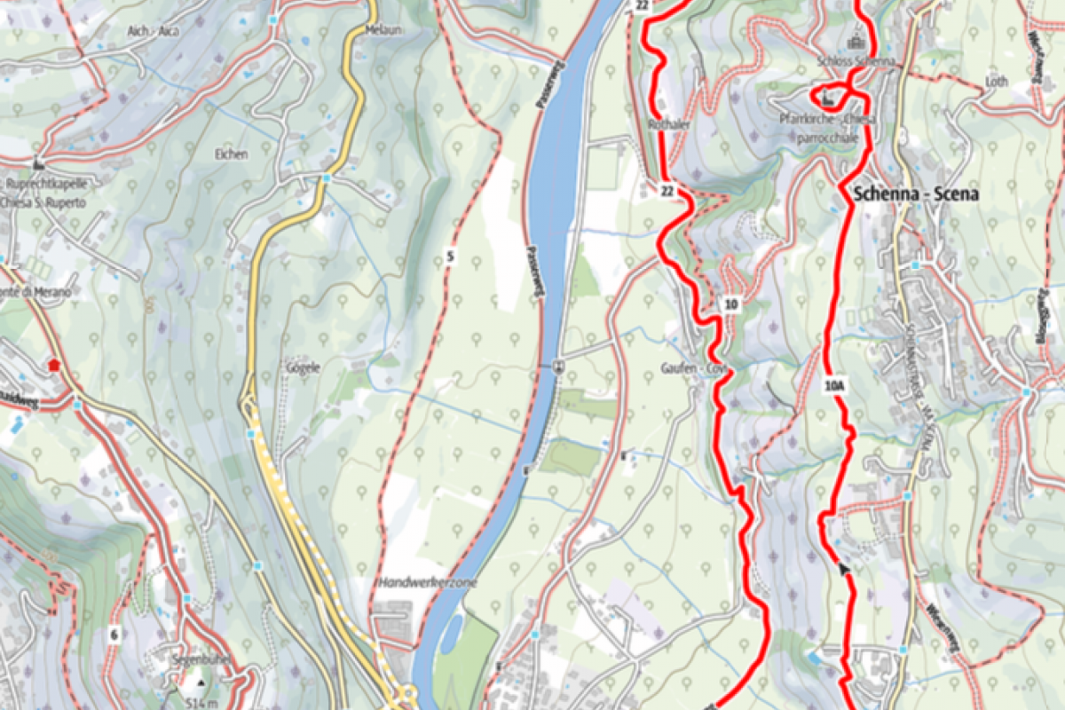 Schwierigkeit: Mittel, kurzes Steilstück vor dem Schwimmbad Schenna