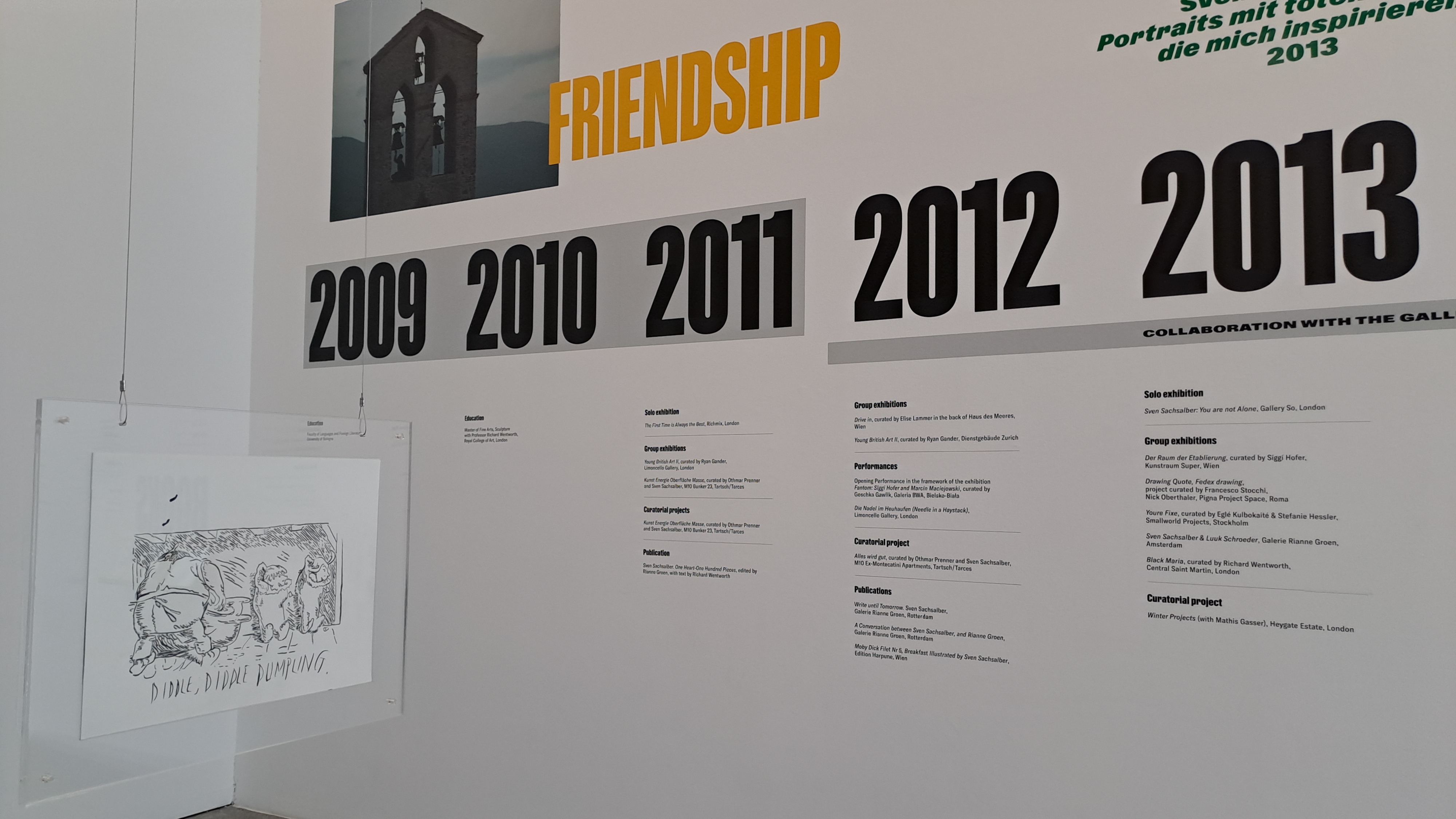 „Sven hatte keine Webseite, das heißt, wir haben tatsächlich bei Null angefangen“, berichtete Lisa Mazza über die langsam, aber kontinuierlich voranschreitende Aufarbeitung und Katalogisierung von Sachsalbers Werk. Neben dem Werkverzeichnis entstanden Gespräche mit über 30 Personen – wichtigen Wegbegleiterinnen und Wegbegleitern des Künstlers. „Es war uns wichtig, diese Stimmen hineinzubringen und dieses Erinnern als eine kollektive Erzählung zu gestalten, anstatt die Recherche nur auf unseren eigenen Blick zu reduzieren“, betonte Mazza.Anschließend wurde die in sechs Teile gegliederte und ebenfalls von Claudia Polizzi gestaltete Ausstellung eröffnet – mit einer Timeline zu Sachsalbers künstlerischem Leben, mit Archivmaterialien, Dokumenten und digitalisierten Werken. Sogar der sonst unsichtbare Klabautermann Pumuckl grüßte von der Wand und schaute auf die Sachsalber-Zeichnungen zu Max und Moritz – versehen mit den punkigen Sprüchen aus Pettibons Feder. God Save Sven Sachsalber.