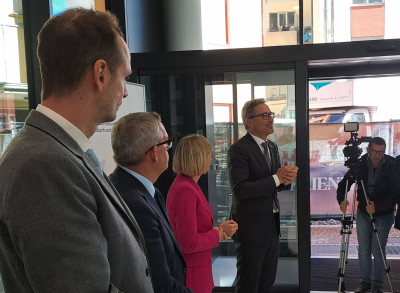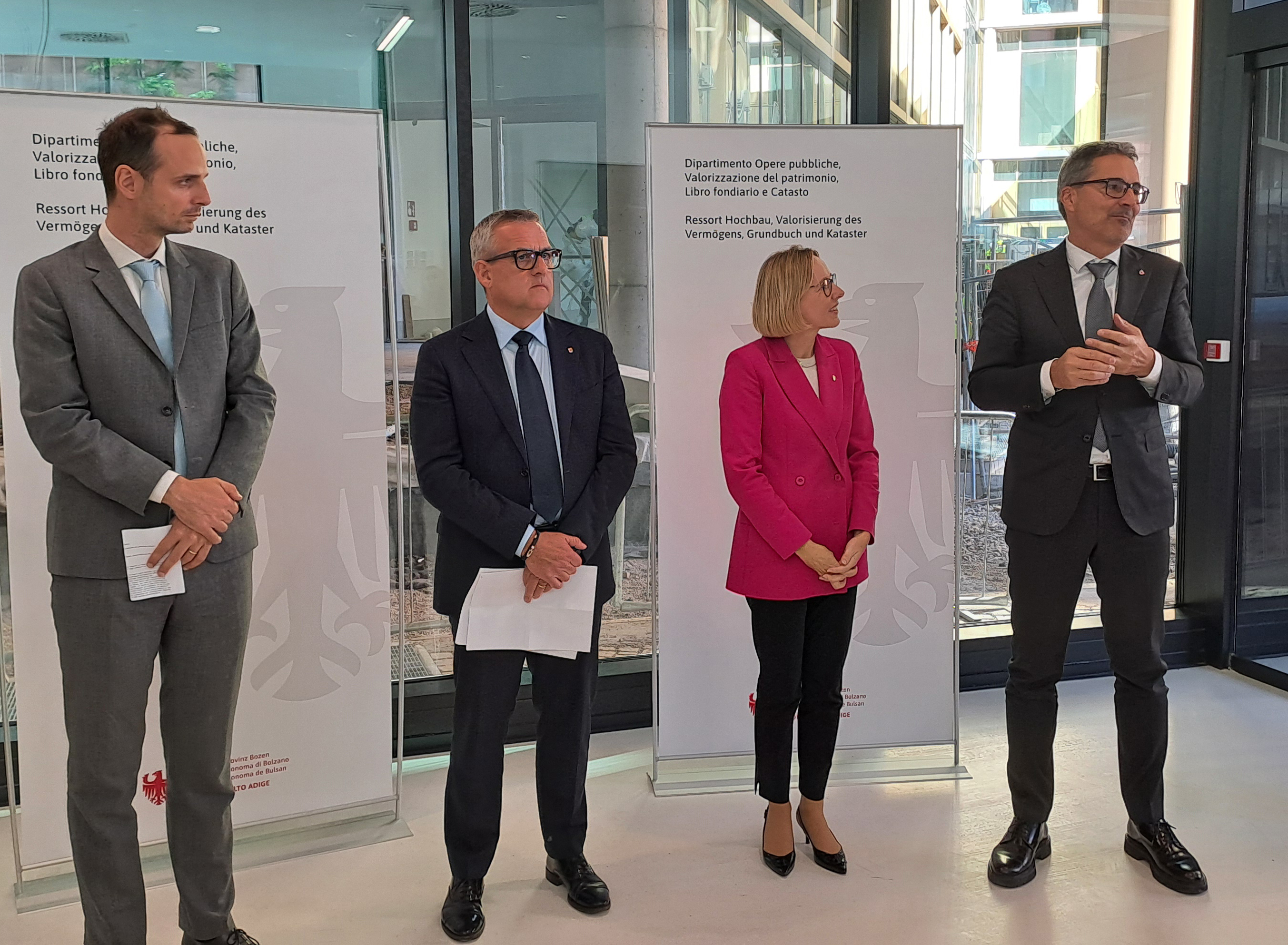 Gute Miene zum bösen Spiel: Thibault Chavanat (WaltherPark) Christian Bianchi, Magdalena Amhof und Arno Kompatscher sprachen zu den "eingekauften" Stockwerken des Landes im WaltherPark. Foto: SALTOMagdalena Amhof spricht vom „symbolischen Neustart“ und berichtet von persönlichen Beobachtungen der letzten Wochen im neuen Gebäude: „Es hat sich unglaublich viel bewegt. Von frühmorgens bis spätabends haben wir hier Menschen auf der Baustelle gesehen – von unterschiedlichsten Gewerken – und es ist gewachsen. Jeden Tag. Und es ist gewachsen in einer unglaublichen Geschwindigkeit. Also wir waren zum Teil beeindruckt, dass von einem Moment auf den anderen was entstanden ist. Und das hat uns schon sehr gut gefallen, auch Teil dessen zu sein“, zeigt sie sich hocherfreut.