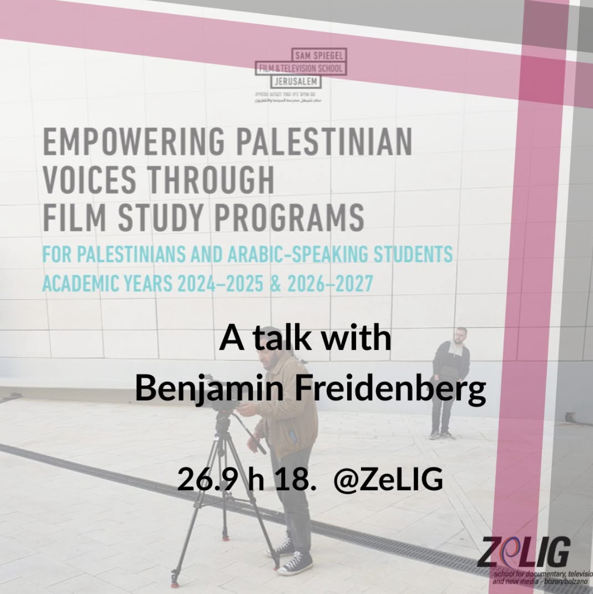 For more than two decades, Benjamin Freidenberg has worked in the art world at the intersection of creativity, activism, and education. At the core of his efforts is a commitment to creating jobs, opening opportunities for artists, and fostering dialogue through collaboration. He recently visited the Zelig School for Documentary, Television and New Media in Bolzano, where he presented his work as director of the Arabic-language programs of the Sam Spiegel Film School in Jerusalem. Together with Dana Blankstein Cohen, then the newly appointed director, he developed initiatives aimed at making film studies accessible for Palestinian students and refugees, fostering and facilitating platforms for Palestinian talents to tell their own stories through cinema.
