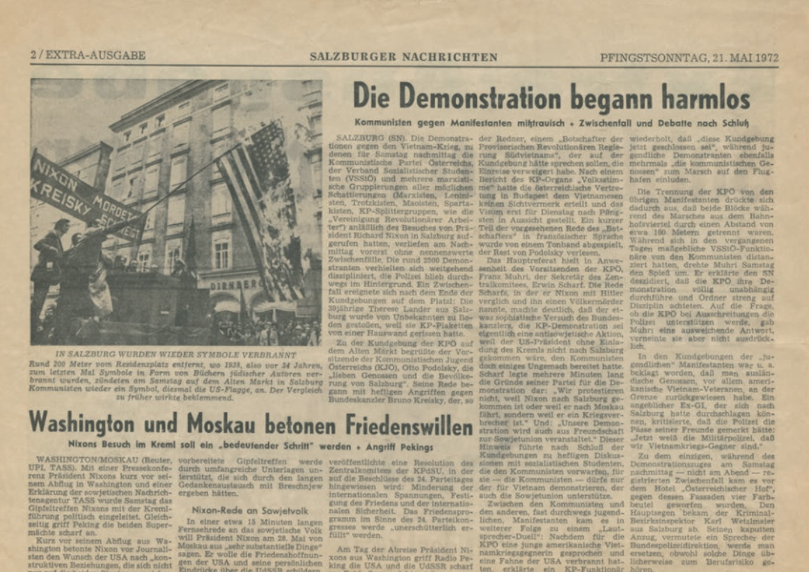 „Eine ganz ungeheuerliche Geschichte", so nannte der Bundesparteiobmann der Österreichischen Volkspartei (ÖVP), Karl Schleinzer, den Protestmarsch gegen US-Präsident Richard Nixon am 20. Mai 1972 in Salzburg. An die 2.500 Menschen fluteten an jenem Samstag die Straßen der Stadt und einige von ihnen holten sich dabei ein blaues Auge, auch Gottfried Solderer. Aber der Reihe nach.