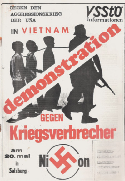 Im Vorfeld von Nixons Besuch in Salzburg wurden österreichweit Flugblätter gegen den US-Präsidenten und seine Vietnam-Politik verteilt. Foto: Edition RaetiaDass es in Salzburg, im Unterschied zu vielen anderen Städten, keine organisierte Studentenbewegung gab, hing wohl auch damit zusammen, dass die Universität kein Hauptgebäude hatte. Die Institute lagen getrennt voneinander über die ganze Stadt verteilt, sodass der Austausch untereinander, wenn überhaupt, nur in kleinen Gruppen stattfand. Eine Möglichkeit des Beisammenseins, des Diskutierens aber auch des Feierns bot der Treff der SH, die „Bude", in der sich Gottfried Solderer mit seinen Kolleginnen und Kollegen über das aktuelle Weltgeschehen unterhielt. Dabei ging es oft um Palästina, wo sich die bereits angespannte Lage mit dem Jom-Kippur-Krieg von 1973 zusätzlich verschärfen sollte. Auch das Schicksal der Kolonien war ein wiederkehrendes Thema, schließlich kämpften damals unter anderem Guinea, Angola und Mosambik für die Unabhängigkeit von Portugal, und im heutigen Simbabwe, damals Südrhodesien, herrschte seit 1965 ein blutiger Guerillakrieg, nachdem das Land sich zuvor eigenmächtig von Großbritannien losgesagt hatte. Das Hauptanliegen der Debatten aber war der Vietnamkrieg, der seit 1955 in Südostasien wütete und sich inzwischen auch auf die Nachbarstaaten Laos und Kambodscha ausgedehnt hatte. Die Sowjetunion und China unterstützten Nordvietnam, die USA kämpften für Südvietnam. Beide Seiten verübten grausame Kriegsverbrechen; Landminen und der Einsatz chemischer Waffen seitens der USA hatten noch viele Jahrzehnte später gravierende Auswirkungen auf das Leben und die Gesundheit der vietnamesischen Bevölkerung. Die USA fürchteten sich vor einer kommunistischen Ausbreitung im südostasiatischen Raum, und diese Angst vor einem „roten" Dominoeffekt führte im Wahljahr 1972 zu einer Eskalation: Das US-Militär verminte Hafenstädte in Nordvietnam, Seeblockaden wurden errichtet und man drohte mit weiteren flächendeckenden Bombenangriffen.