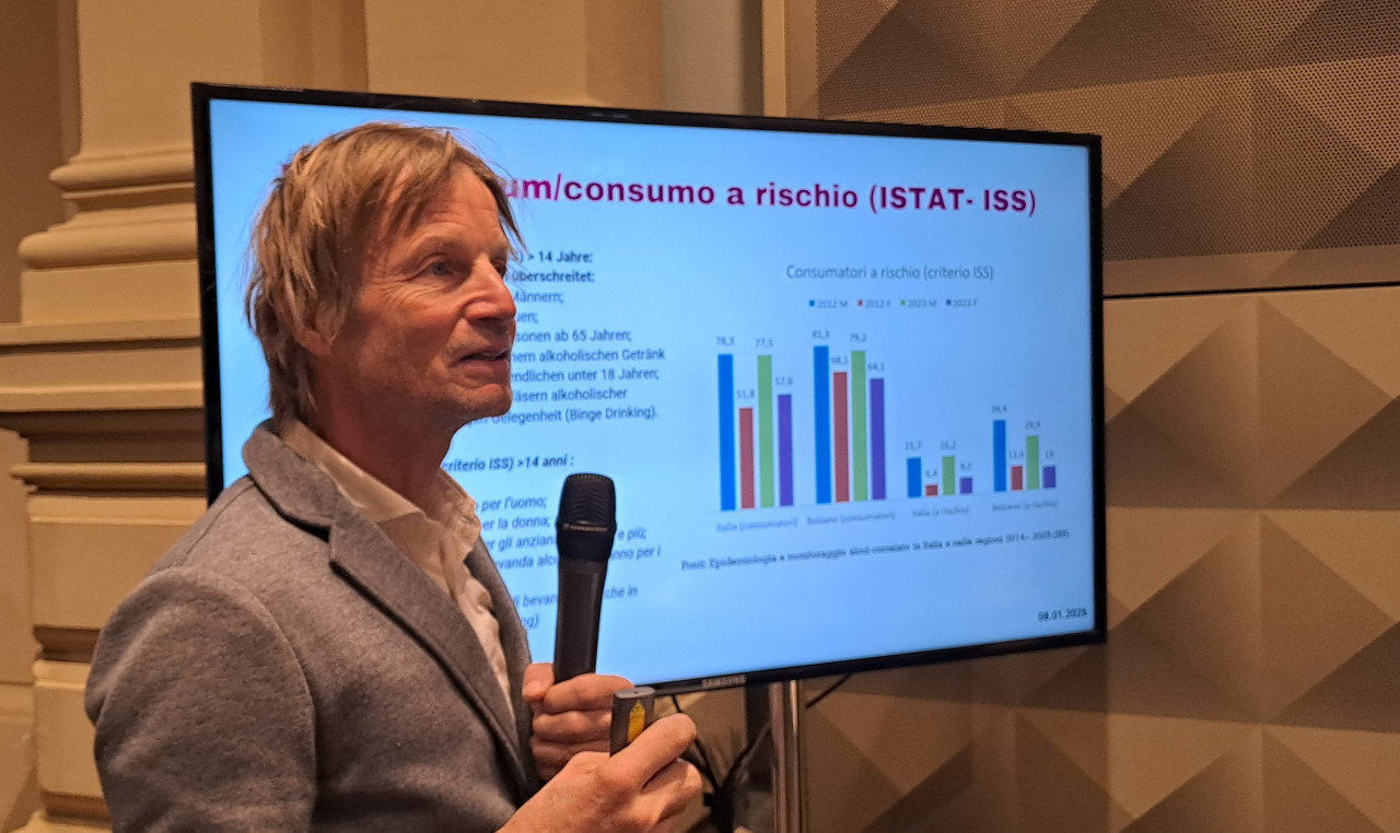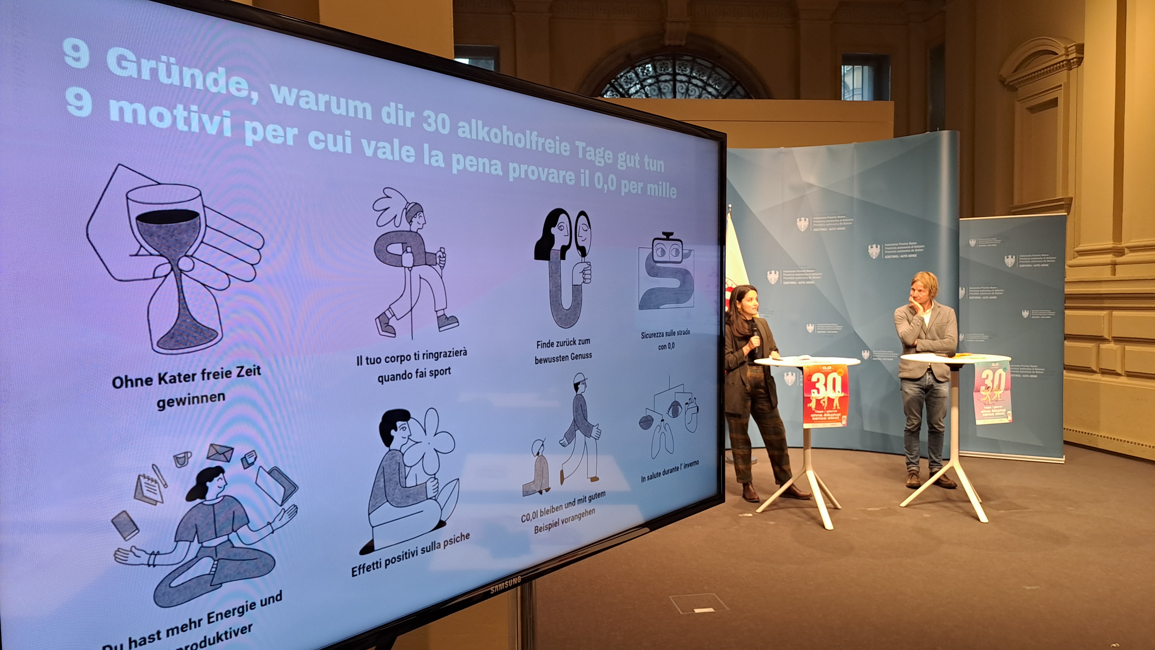 Einfach statt doppelt: Mit klarem Blick auf die Statistik. Das Forum Prävention führt die landesweite Aktion gemeinsam mit dem Südtiroler Sanitätsbetrieb, dem Gesundheitsressort des Landes und Partnern aus Bildungs-, Sozial- Handel- und Sportbereich (AVS, USSA, VSS, CAI) und dem Hoteliers- und Gastwirteverband (HGV) und dem Katholischen Verband der Werktätigen (KVW) durch. Foto: SALTO/HMDie Direktorin des Dienstes für Abhängigkeitserkrankungen Bettina Meraner betonte, dass besonders Erwachsene Verantwortung tragen, da sie im Umgang mit Alkohol eine wichtige Vorbildrolle für Kinder und Jugendliche haben. Die Kampagne will aufzeigen, wie konkrete Lebenssituationen ohne Alkohol gemeistert werden, wie Gewohnheiten unterbrochen und neue Erfahrungen gemacht werden können. Der Januar werde dabei als geeigneter Zeitpunkt gesehen, um innezuhalten, das vergangene Jahr zu reflektieren und neue Vorsätze zu fassen. Sie wünschte der Kampagne viel Erfolg.