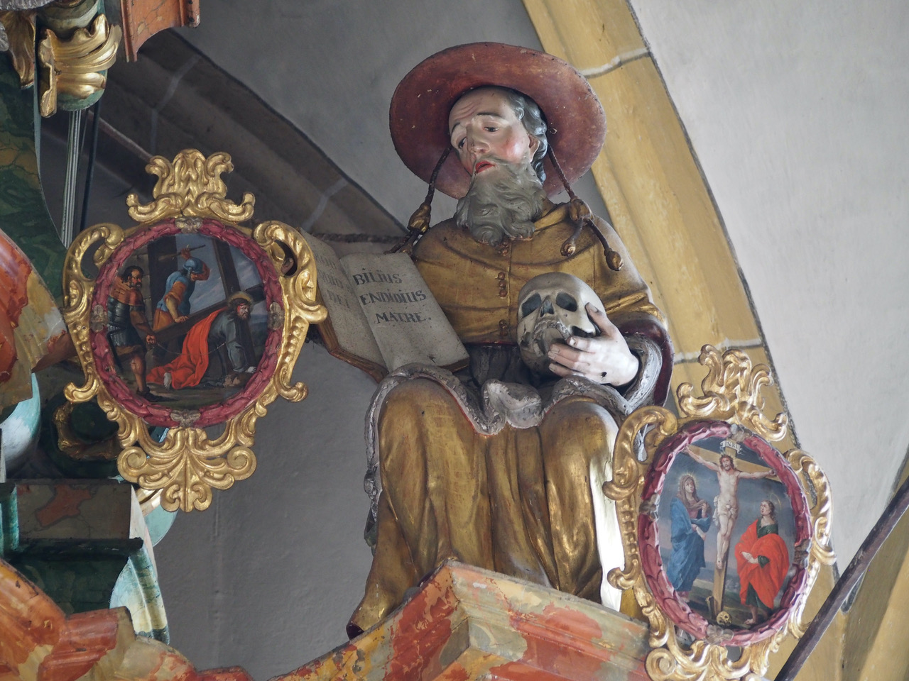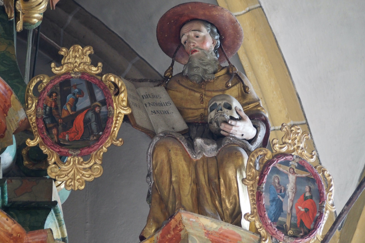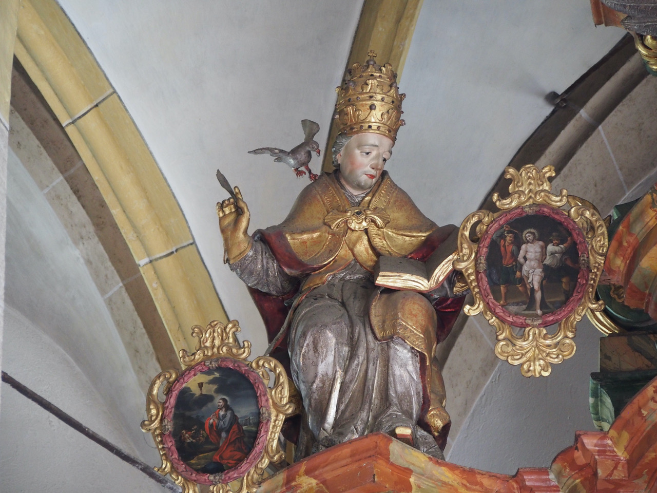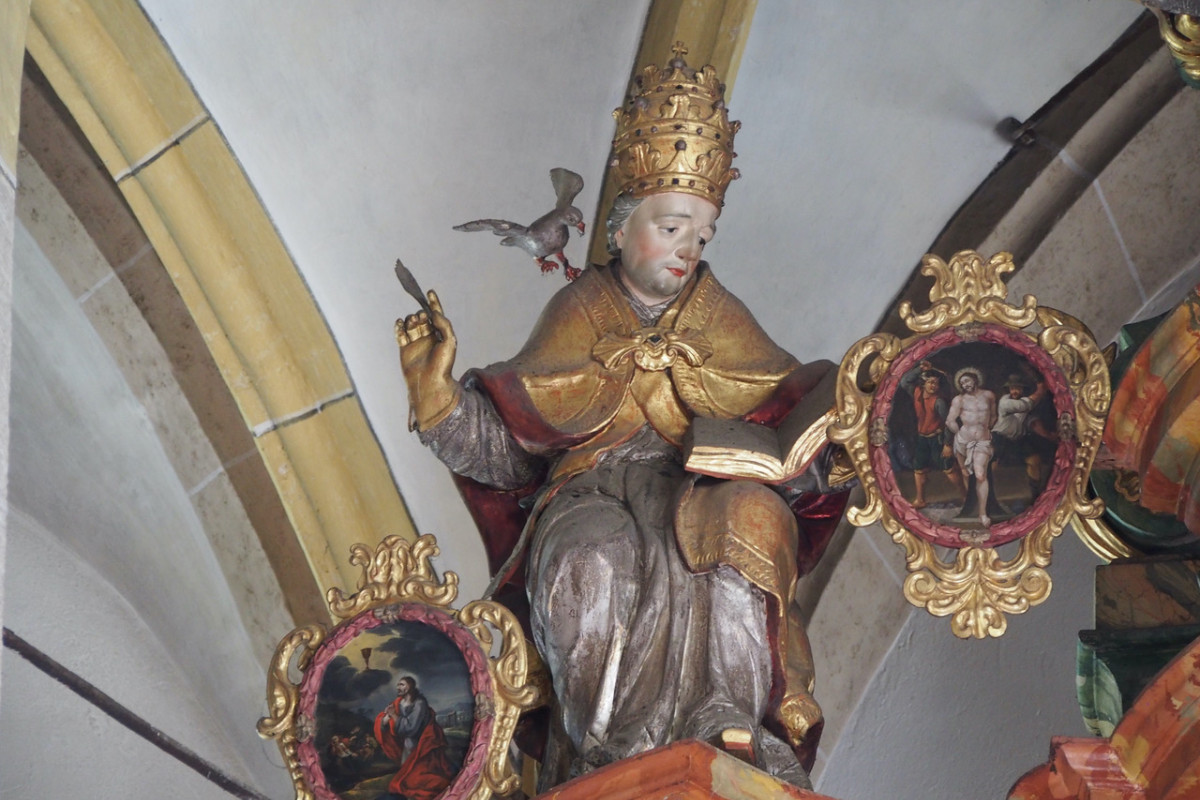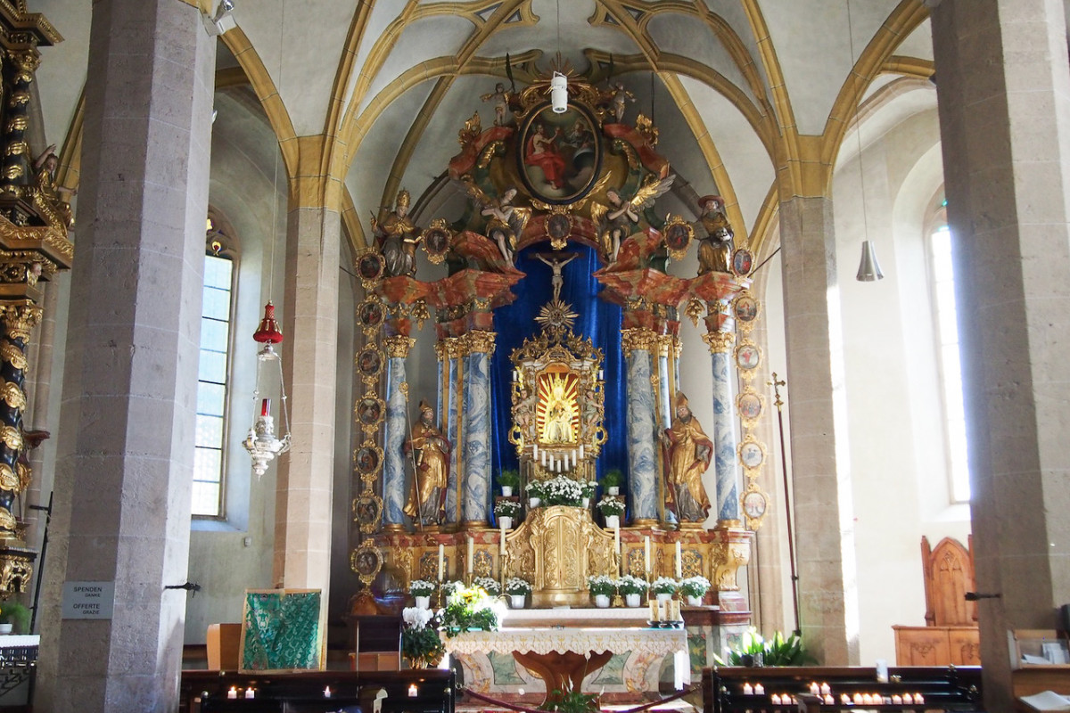 Die Kirche selbst ist eindrucksvolles Gesamtkunstwerk, das in dieser ländlichen Abgeschiedenheit besonders erstaunlich ist. Der Turm stammt noch aus romanischer Zeit, die Kirche erhielt ihre heutige Gestalt im 15. Jh. Die prächtigen, reich verzierten Altäre in Schwarz und Gold stammen aus der Zeit des Barock. Am Hochaltar ist in einem hochbarocken vergoldeten Schrein das verehrte Gnadenbild aus Gussmasse aus der Mitte des 15. Jh. ausgestellt, es stellt die Muttergottes mit dem nackten Jesukind, das eine Birne in der Hand hält, dar. Auch die Seitenaltäre sind wertvoll und interessant, jener der Volks- und Pestheiligen Rochus und Sebastian stammt aus dem Dominikanerkloster in Bozen, kurios die dargestellten Gläubigen in der Bozner Bürgertracht.