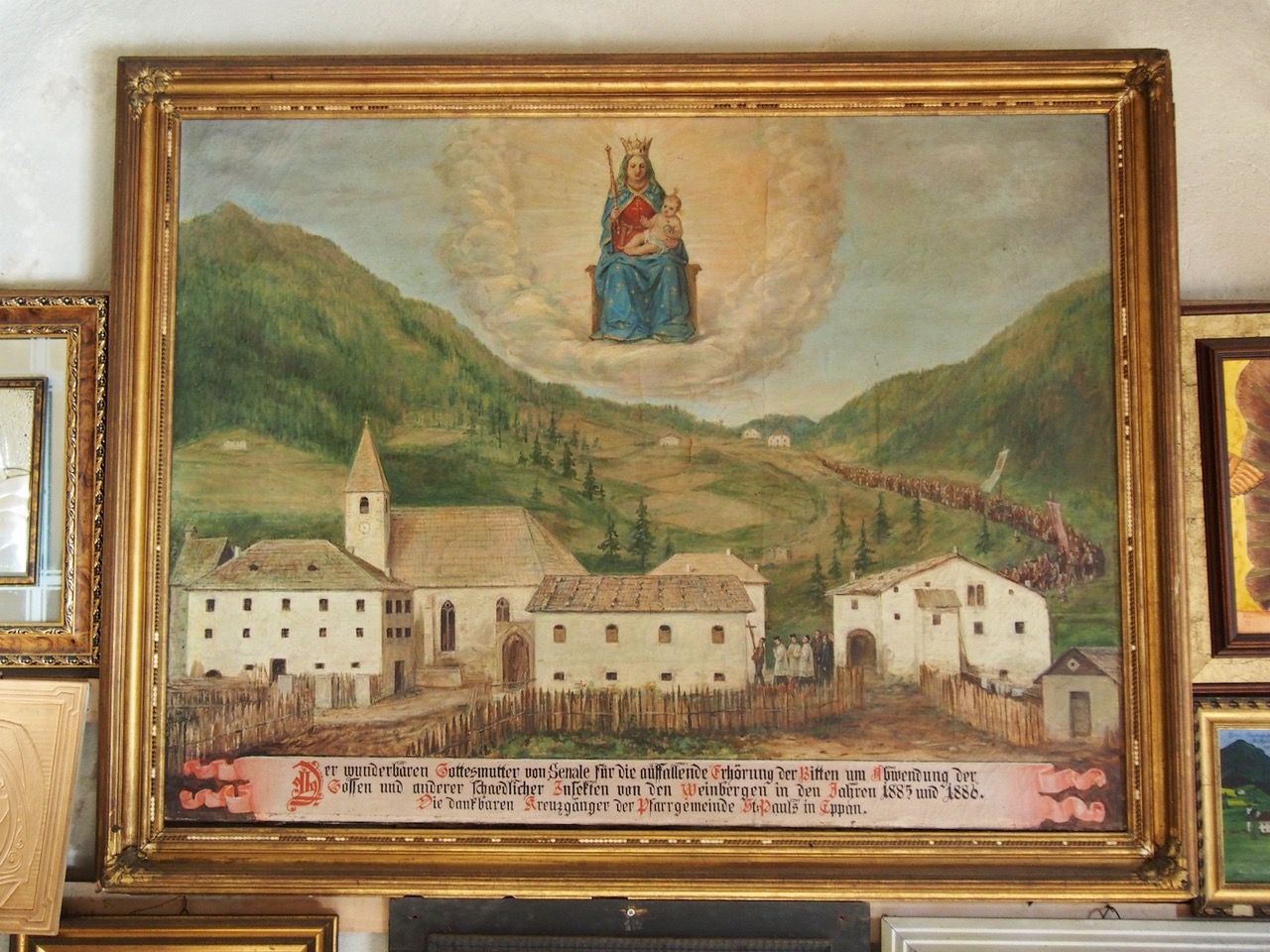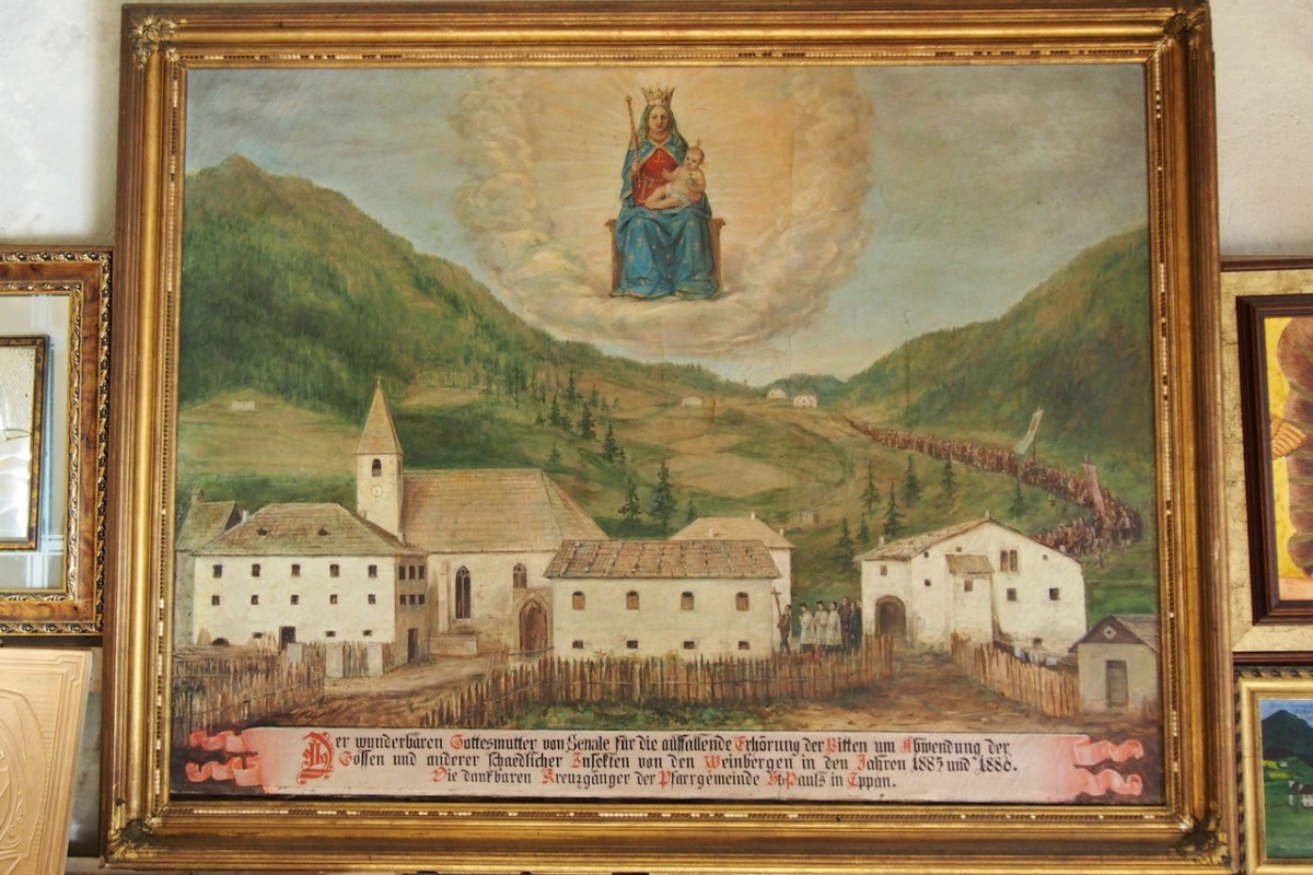 In der Kirche findet sich für jeden Trostsuchenden der entsprechende Heilige, es würde zu weit gehen, alle aufzuführen. Die vielen Votivbilder an der hinteren Wand zeigen den tiefen Volksglauben der Pilger, deren Anliegen erhört wurden. Ein Beispiel: Weinbauern aus St. Pauls und Eppan stifteten ein Bild, das an die Abwendung der „Gossenplage“ – damit war die Reblaus gemeint – durch die Fürbitte Marias in den Jahren 1885/86 erinnert.