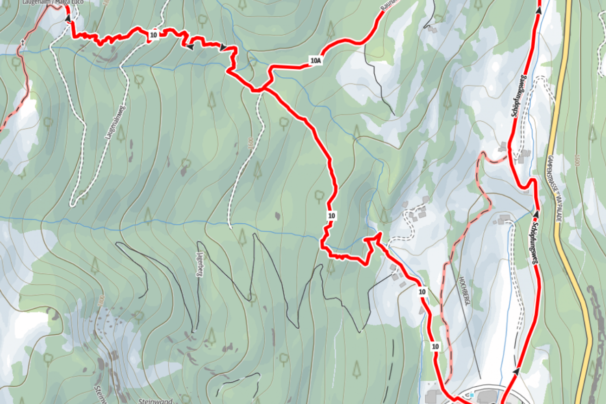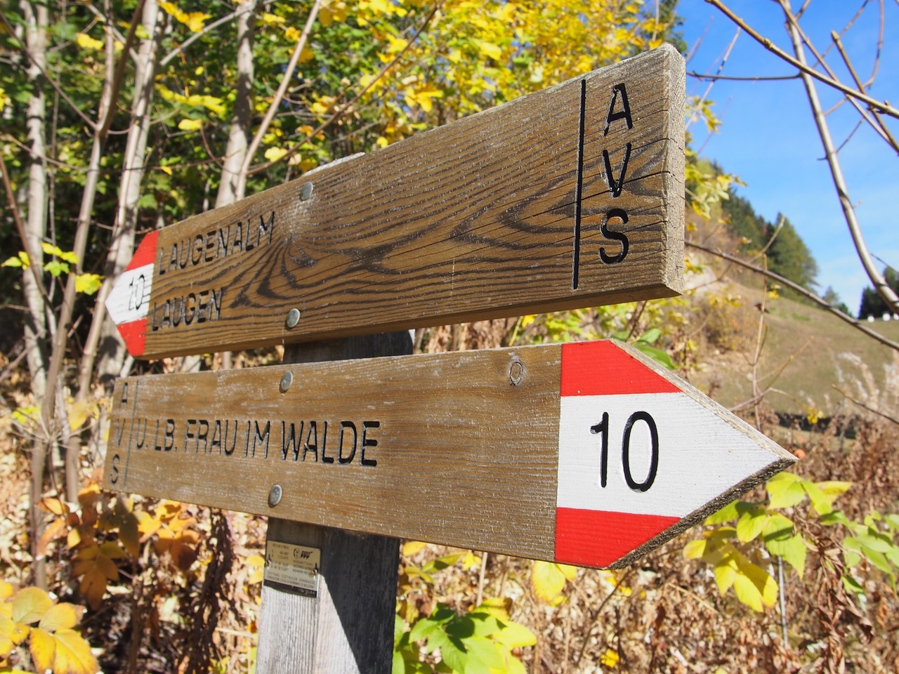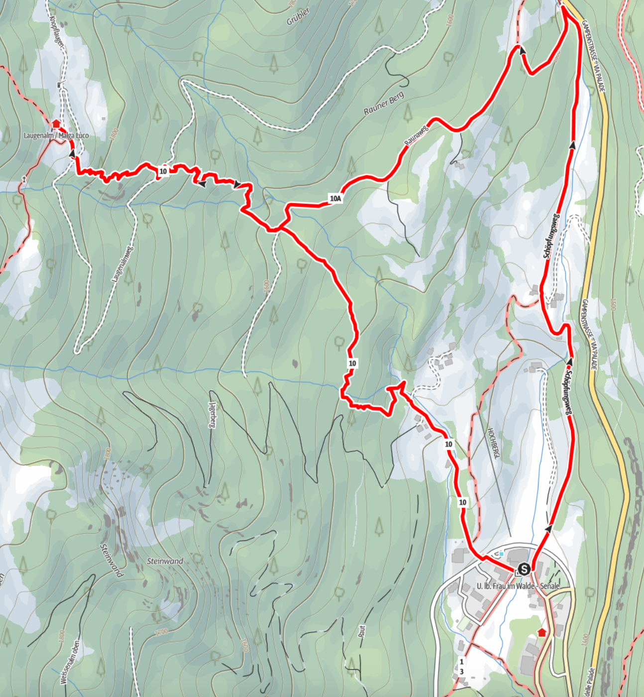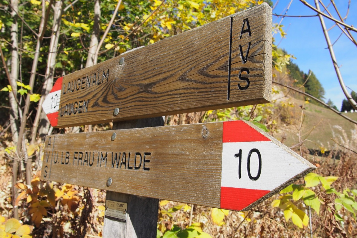 Für eine einfache Rundwanderung zur aussichtsreichen Laugenalm parken wir hinter der Kirche, überqueren die Straße, gehen rechts am Widumhof vorbei und folgen den Wegweisern zum Pilgerweg bergauf. Wir sind dabei auf dem 2011 eingeweihten Weg unterwegs, die Route bringt uns vorbei an den Kreuzwegstationen in Richtung Gampenjoch. Kurz vor dem Joch, nach einer knappen Gehstunde, biegen wir links auf den Wald- und Wiesenweg (Nr. 10A) ein, der zuerst in sanfter Steigung und im letzten Stück auf holprigem, steilem Steig, eine Schleife des Forstweges abschneidend, zur Laugenalm (1.853 m) führt (bis hierher 1 Stunde 50 Minuten). Für den Rückweg gehen wir ein Stück des Aufstiegssteiges zurück und nehmen bei einer Wegteilung rechts den Steig Nr. 10, der uns wieder ins Dörfchen und zur Kirche zurückbringt.