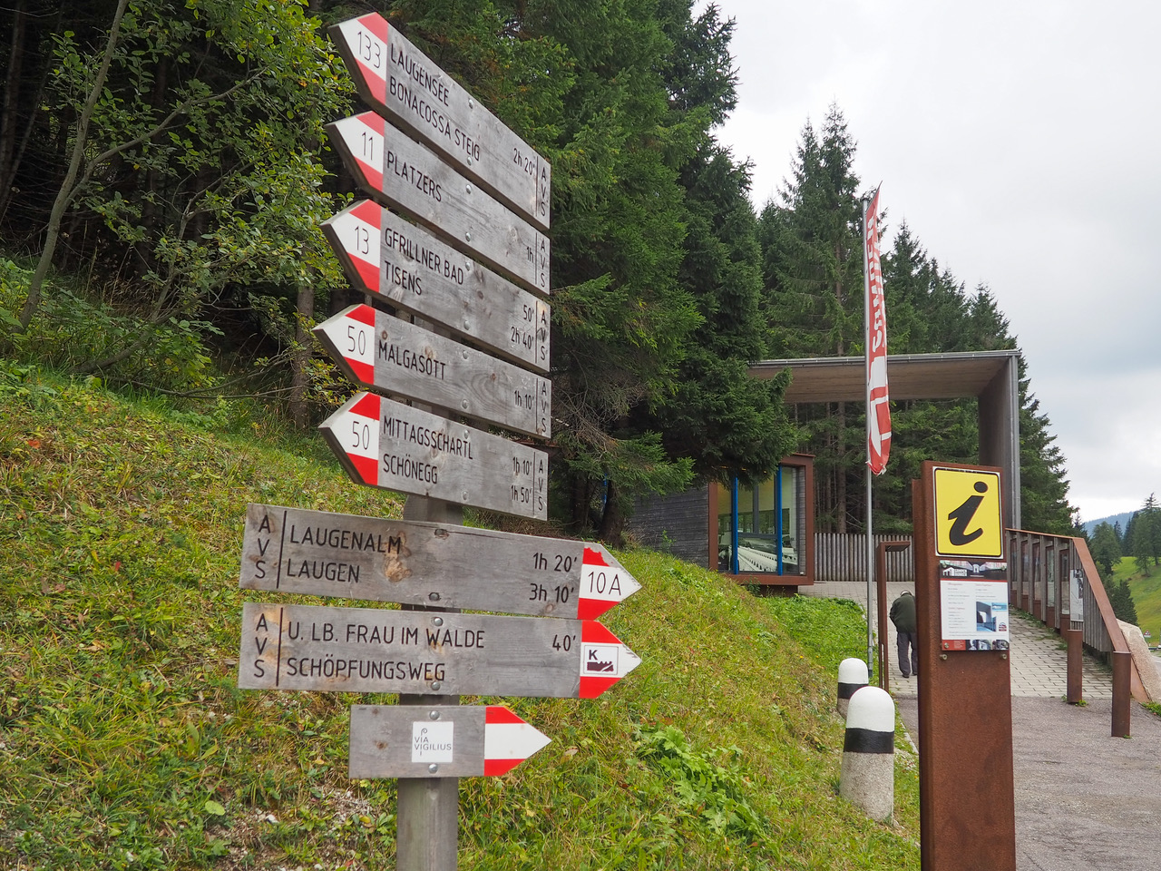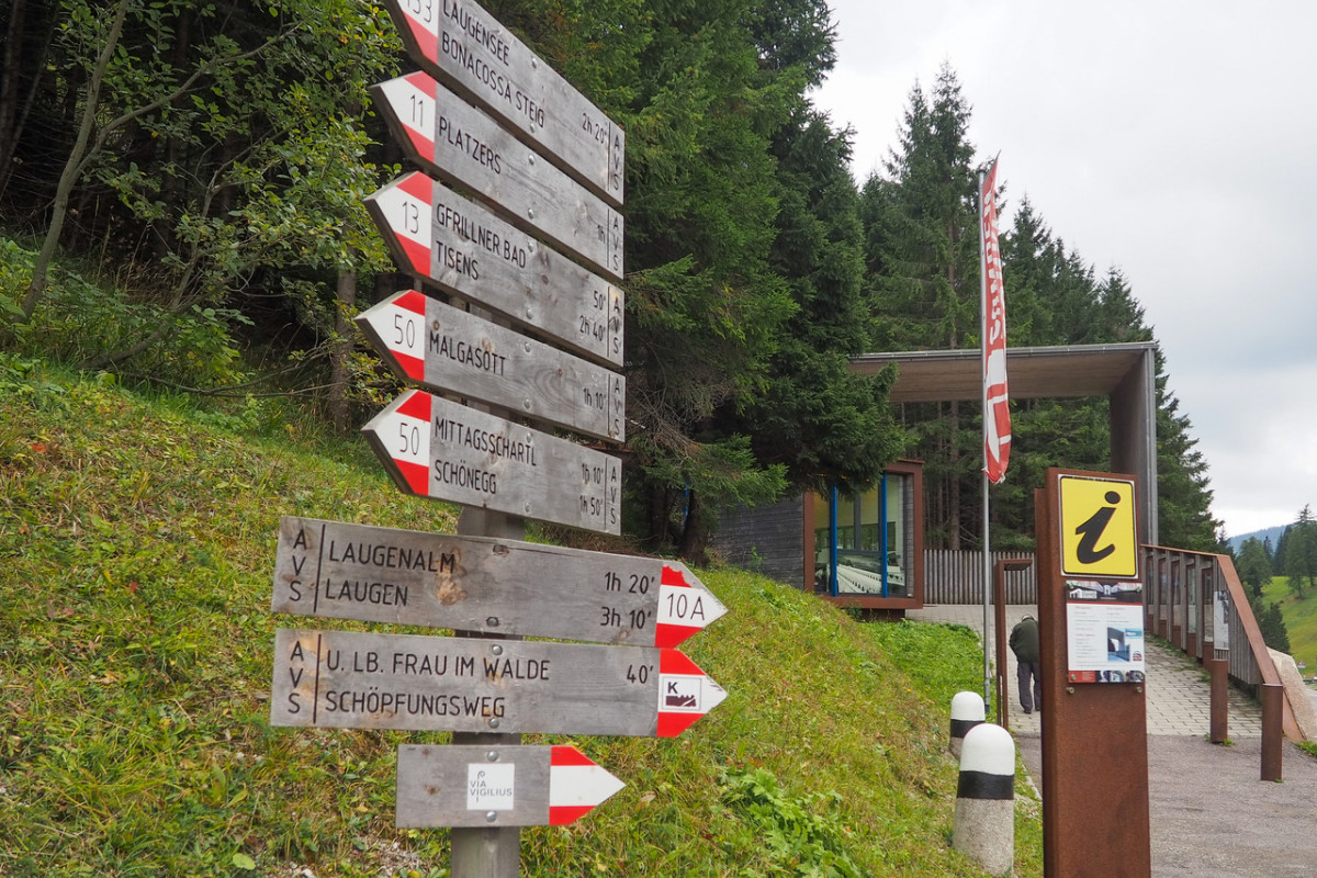 Wer nicht den etwas steilen Aufstieg zum Laugenalm einschlagen möchte, bleibt auf dem Pilgerweg bzw. Schöpfungsweg, der zum Gampenjoch führt. Dort Einkehrmöglichkeit beim Gasthof Gampenpass, Gampenstraße 5, Tel. 0463 721664.