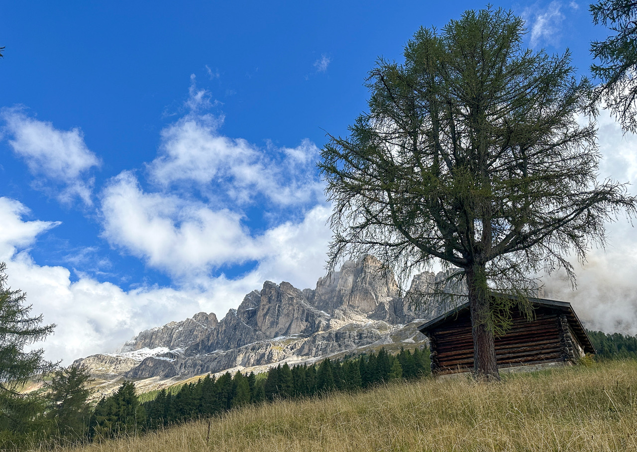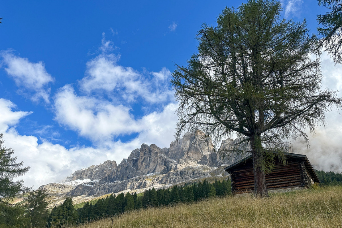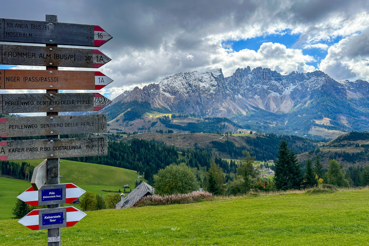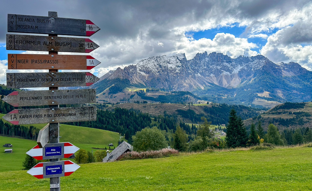 Der Nigerpass am Fuß des Rosengartens verbindet das Tierser- mit dem Eggental. Die sonnigen Hänge und zwischen Niger- und Karerpass sind ein ideales Wandergebiet, mit offenen, weiten Almwiesen und einer Reihe von Einkehrmöglichkeiten, dazu relativ stadtnah und auf guten Straßen auch mit Öffis leicht zu erreichen. Im Herbst ist eine gute Zeit, der Touristenandrang hält sich in Grenzen, auf den Wegen ist kaum was los. Ueine Unser Ziel ist heute der Gasthof Jolanda, in freier Lage auf 1840 m etwas oberhalb der Straße gelegen, welche den Niger- mit dem Karerpass verbindet.