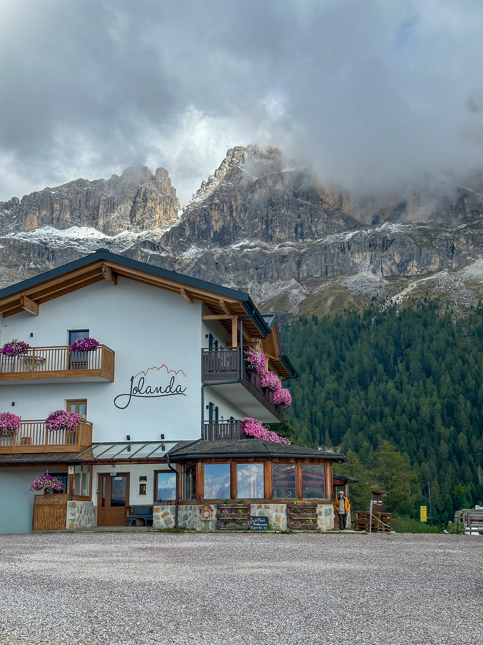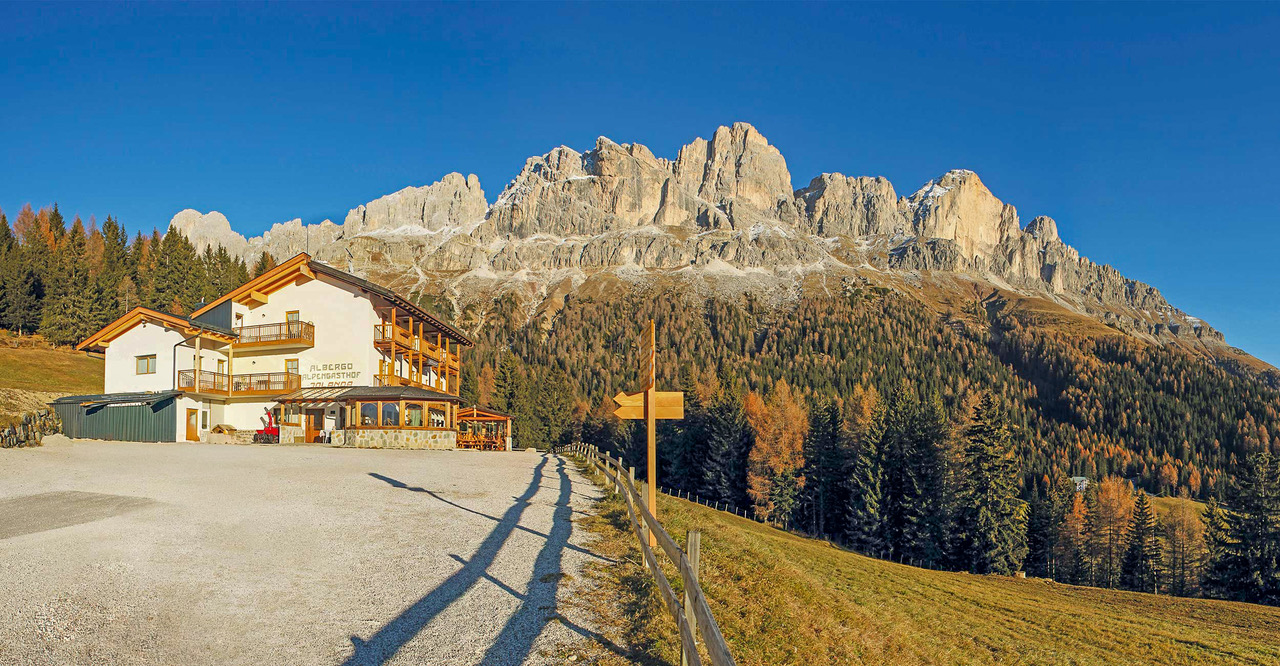 Der Alpengasthof liegt in Prachtposition mit Blick zu den Wänden des Rosengartens. Windgeschützte Terrasse, gutbürgerliche Küche, hausgemachte Kuchen und Torten.