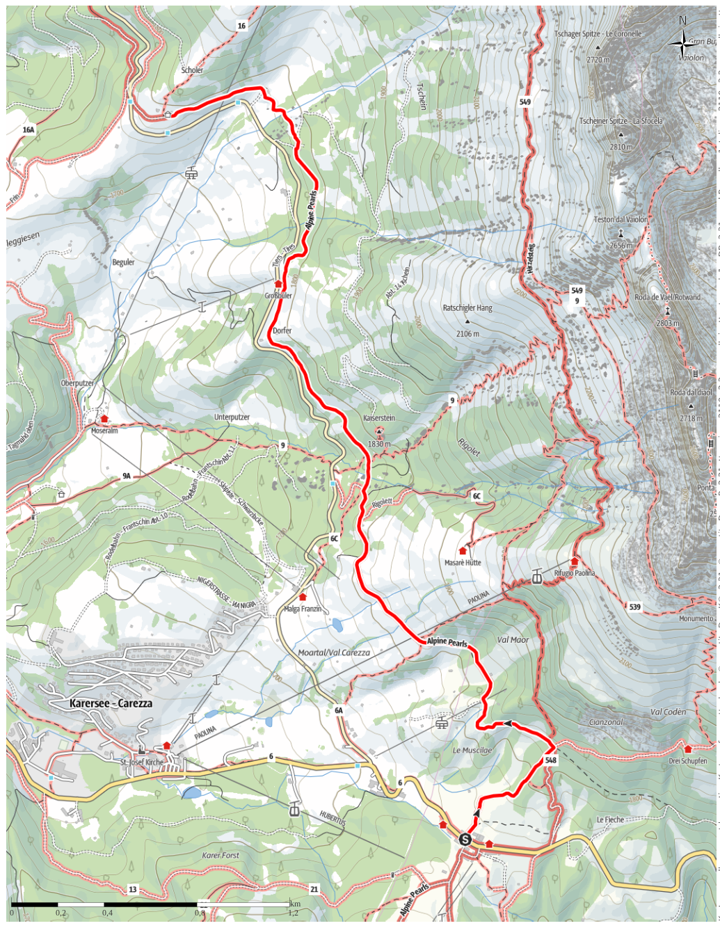 Ausgangspunkt ist der Karerpass, neben dem im Stil der Jahrhundertwende erbauten und z.Z. geschlossenem Hotel Savoy startet der Wanderweg mit dem klingenden Namen „Perlenweg“. Uber Wiesen geht es auf die Hänge unter der Paolinahütte zu, nach einem kurzen Waldstück mit einem etwas steilen Anstieg -es sind etwa 100 Höhenmeter zu überwinden- erreichen wir einen hangquerenden Steig, dem wir nun im leichten Auf- und Ab westwärts folgen. Wir queren die Wiesenhänge einer Skipiste, es geht an Almhütten vorbei, durch Waldstücke, im Bann der beeindruckenden Dolomitwände des Rosengartenmassivs und mit toller Aussicht zum Latemar. Etwas unterhalb verläuft die kaum befahrene Autostraße. Nach etwa 1 Stunde und 35 Minuten erreichen wir den Gasthof Jolanda, der auf einem kleinen Geländevorsprung einen dominierenden Platz einnimmt und sich im Untertitel jetzt Mountain Living nennt. Rückweg wie Hinweg.