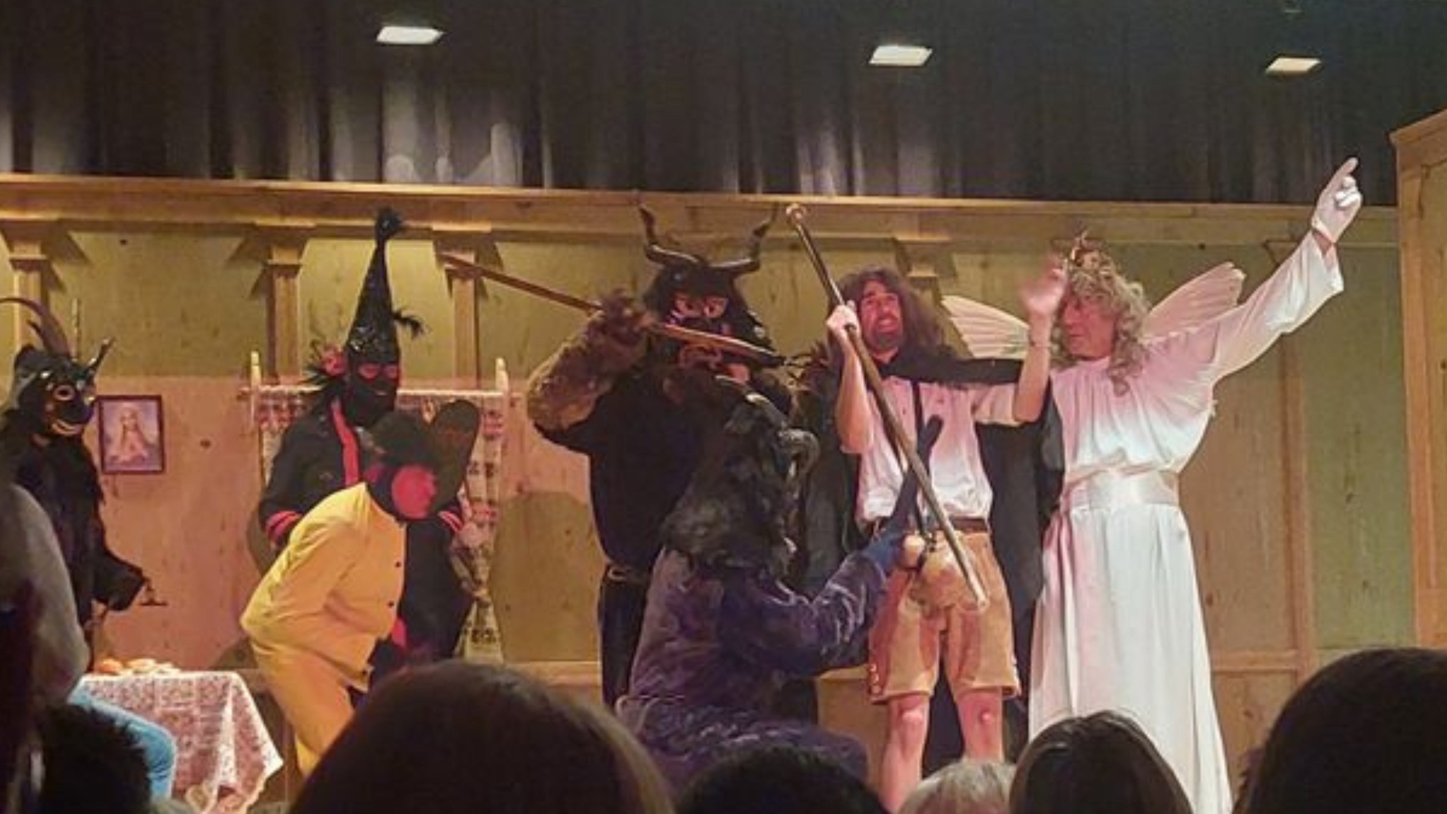 Wieder der Nikolaus. Beelzebub und Klaubauf. Allerlei Teufel gegen allerlei Engel, einmal Jesus, oder ist es sein Vater? Der Höllenfürst Luzifer mit Plateauschuhen, einen Kopf größer als alle anderen. Er und Beelzebub auf der einen Seite und der Engel auf der anderen streiten um die Weiße Seele.