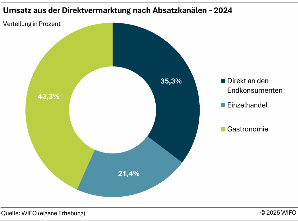 Über 40 Prozent des Umsatzes entfallen auf das Gastgewerbe, wobei diese Verkäufe meist über den Zwischenhandel abgewickelt werden. Rund ein Drittel des Umsatzes wird über den direkten Verkauf erzielt, vor allem über den Ab-Hof-Verkauf (15,3 Millionen Euro) und Bauernmärkte (3,8 Millionen Euro). Rund 40 Prozent der Ab-Hof- und Bauernmarktverkäufe gehen dabei an Gäste. Etwa 20 Prozent gelangen schließlich in den Einzelhandel.