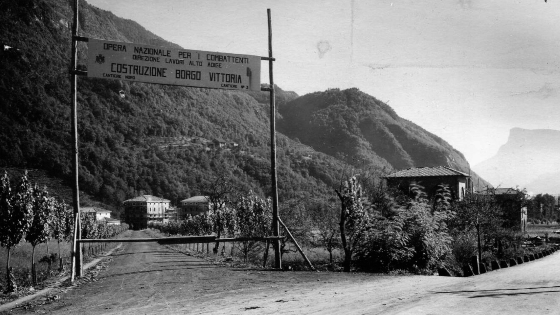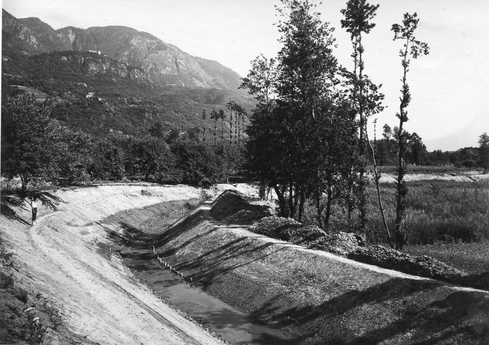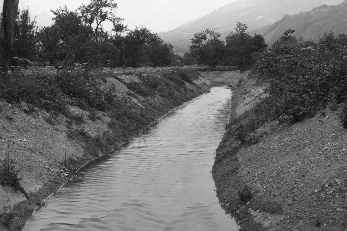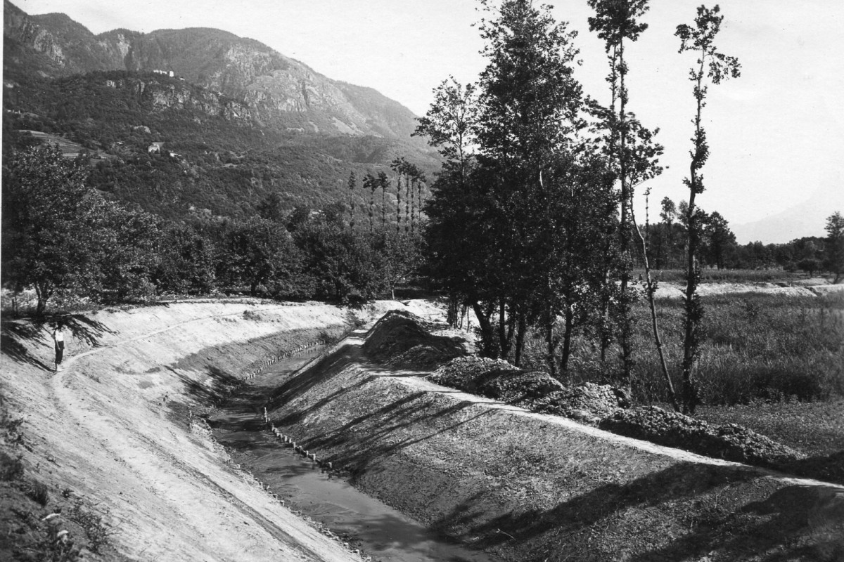 Altes Sinich: Das Gebiet des ehemaligen Etschlaufs wurde durch ein ausgeklügeltes Entwässerungssystem trockengelegt und von italienischen Kolonisten besiedelt. Auf der Fotografie des ältesten Gemeindeteils „Borgo Vittoria“ lässt sich noch ein großer Hauptkanal hinter der Dorfkirche erkennen. Foto: Tommaso CortellessaDie SALTO Video-Reportage, die dem Problem des Grundwassers unter den Gullys, in den Straßen und auf den Feldwegen Sinichs auf den Grund geht, findest du HIER.