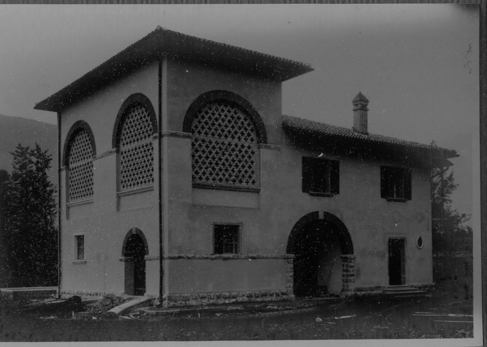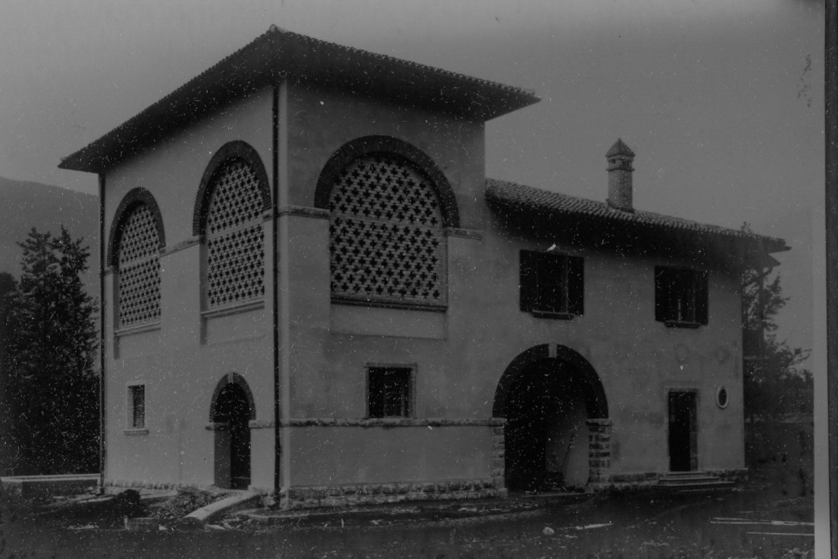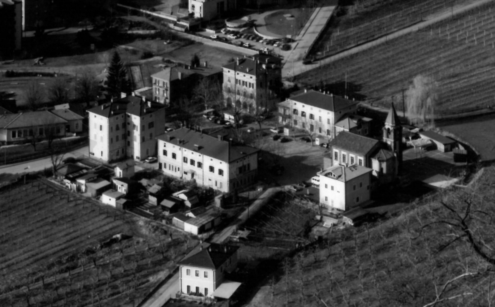 Altes Sinich: Das Gebiet des ehemaligen Etschlaufs wurde durch ein ausgeklügeltes Entwässerungssystem trockengelegt und von italienischen Kolonisten besiedelt. Auf der Fotografie des ältesten Gemeindeteils „Borgo Vittoria“ lässt sich noch ein großer Hauptkanal hinter der Dorfkirche erkennen. Foto: Tommaso CortellessaDie SALTO Video-Reportage, die dem Problem des Grundwassers unter den Gullys, in den Straßen und auf den Feldwegen Sinichs auf den Grund geht, findest du HIER.