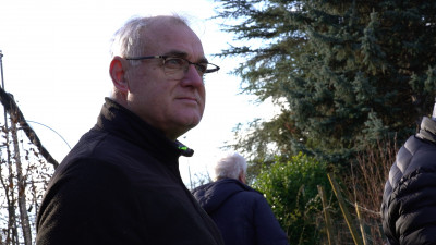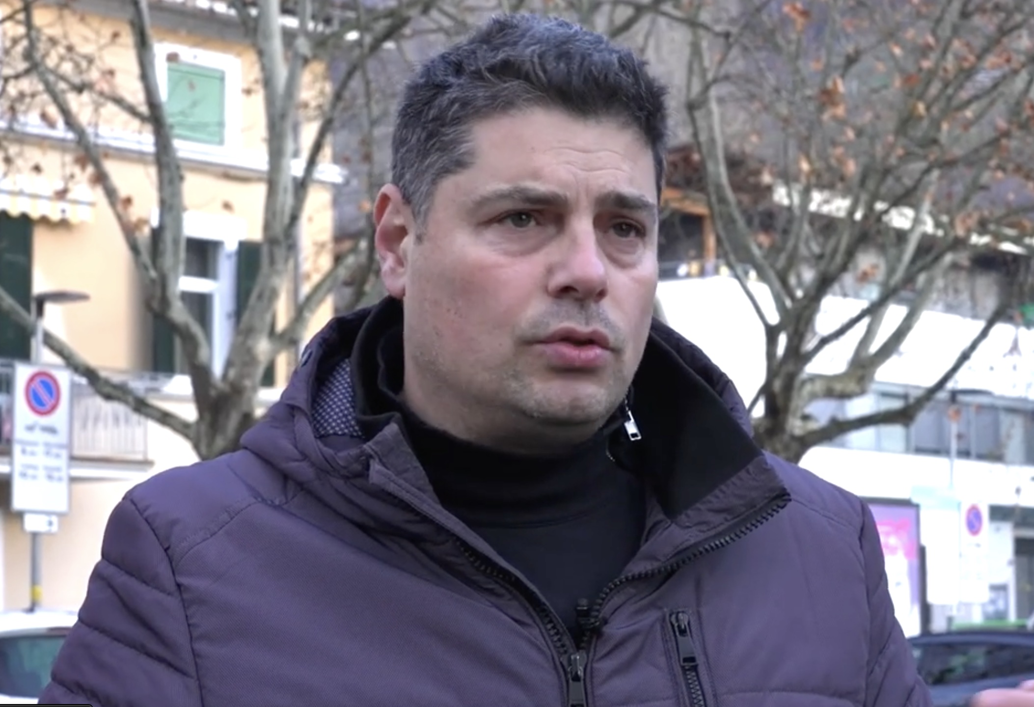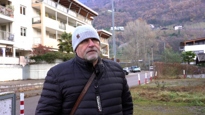 Fabrizio Nicolini: steht auf einem der ehemaligen Kanäle, der einst das Grundwasser in die Etsch leitete. Foto: Mauro PodiniDort, wo heute Autos parken, verlief einst einer der wichtigsten Entwässerungskanäle Sinichs: ein offener Kanal nördlich des Ortskerns – der heutigen Piazza Vittorio Veneto –, der das Wasser sammelte, das vom Naiftal auf Sinich herabfließt und den Grundwasserspiegel anhebt.