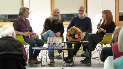 Gesprächsrunde zu Gottfried Solderer: Adina Guarnieri am Podium mit Georg Mair, Christoph Franceschini und Hans Heiss. Foto: Tessmann/RaetiaReimen ist doof, Schleimen ist noch doofer… Auf welches – anscheinend gute – Buch konnten Sie sich nie wirklich einen Reim machen?