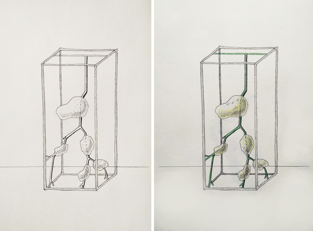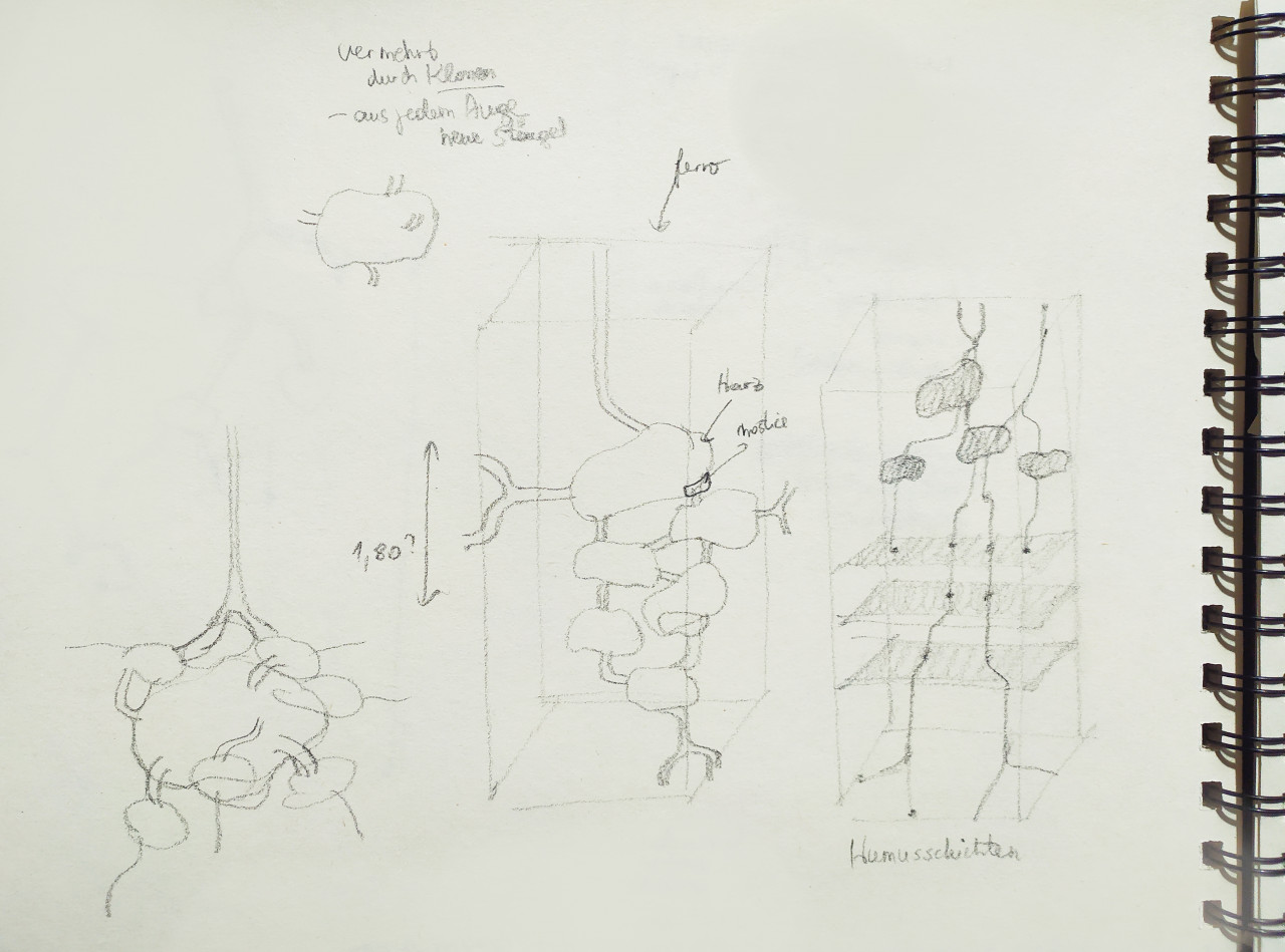 Wenn man zeichnet, wirft man viele Ideen aufs Blatt und findet oft im Nachhinein die Gelegenheit diese weiterzuentwickeln und etwas Konkretes daraus entstehen zu lassen. Dieser Vermehrungsprozess ist eine Metapher für das Leben, ich interessiere mich für das, was lebendig ist, keimt, sich verändert und verwandelt, die Organismen und deren biologische Funktionen. Dieser Satz lässt sich mit dem biologischen Prozess gut in Verbindung setzten: „das Ganze ist mehr als die Summe seiner Teile“. Die Mutterknolle generiert Leben und es entsteht nicht nur etwas Neues und ein Mehrwert, sondern ein ganzes System.