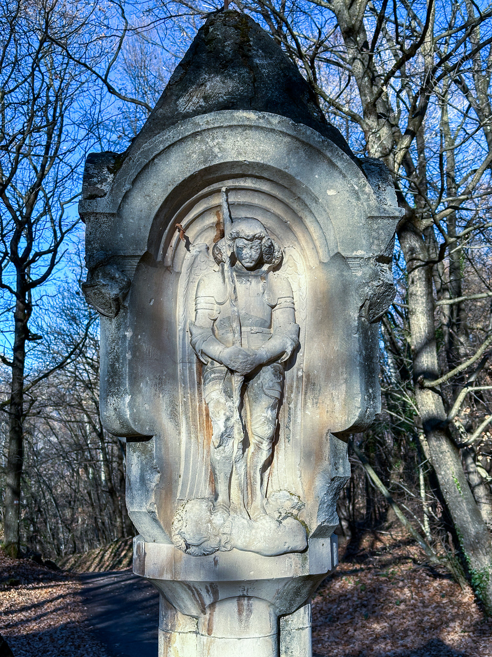 Ein steinernes Denkmal erinnert hier an einen verunglückten Kaiserjäger im fernen 1912. Nach einer Schranke beginnt ein schöner Waldweg, im Verhältnis zu den vorangegangenen steilen Passagen sind wir auf einer Promenade unterwegs! In sanfter Steigung führt uns der Weg am Putzerhof und der romanischen Kirche von St. Jakob vorbei in die gleichnamige Siedlung an der Brennerstaatsstraße mit der Bushaltestelle.