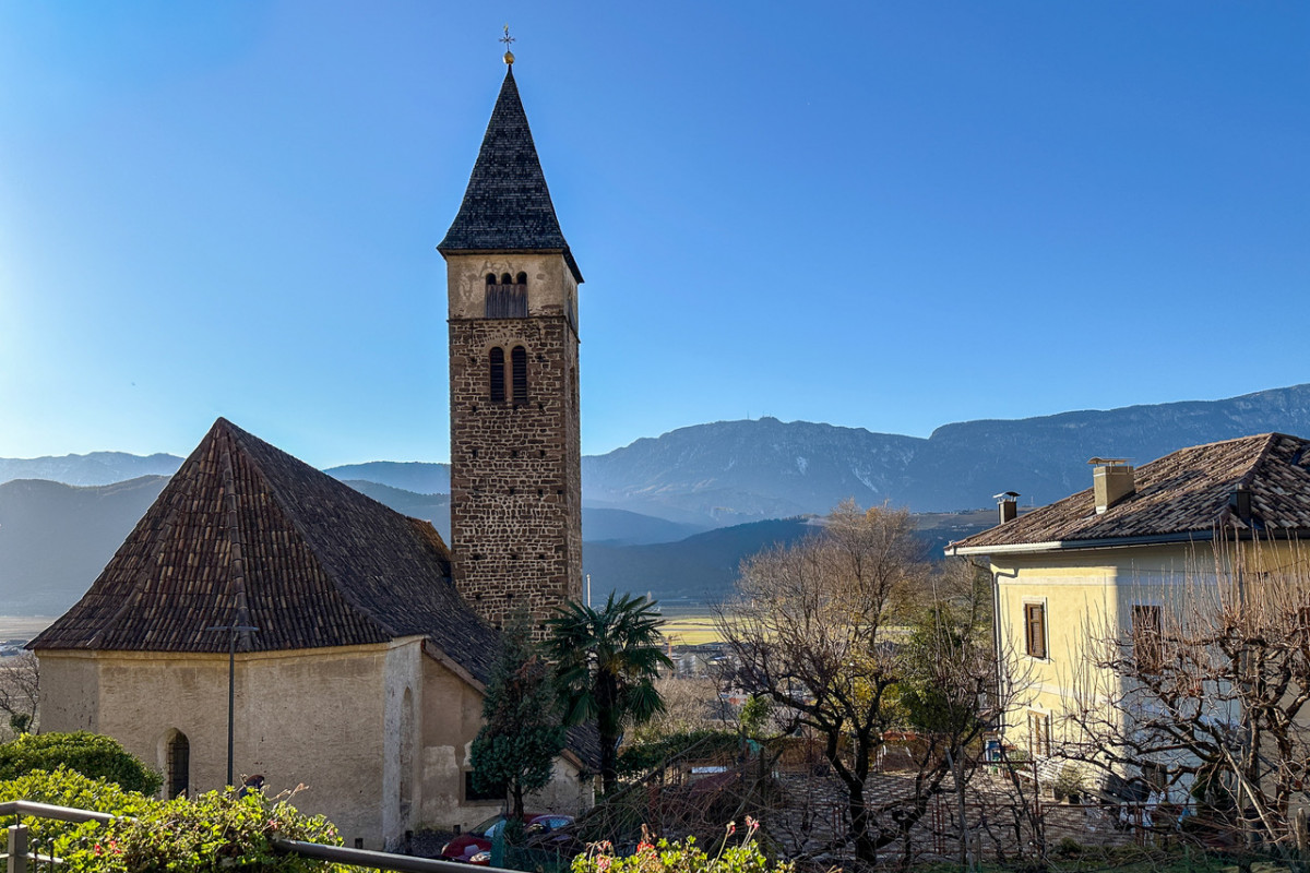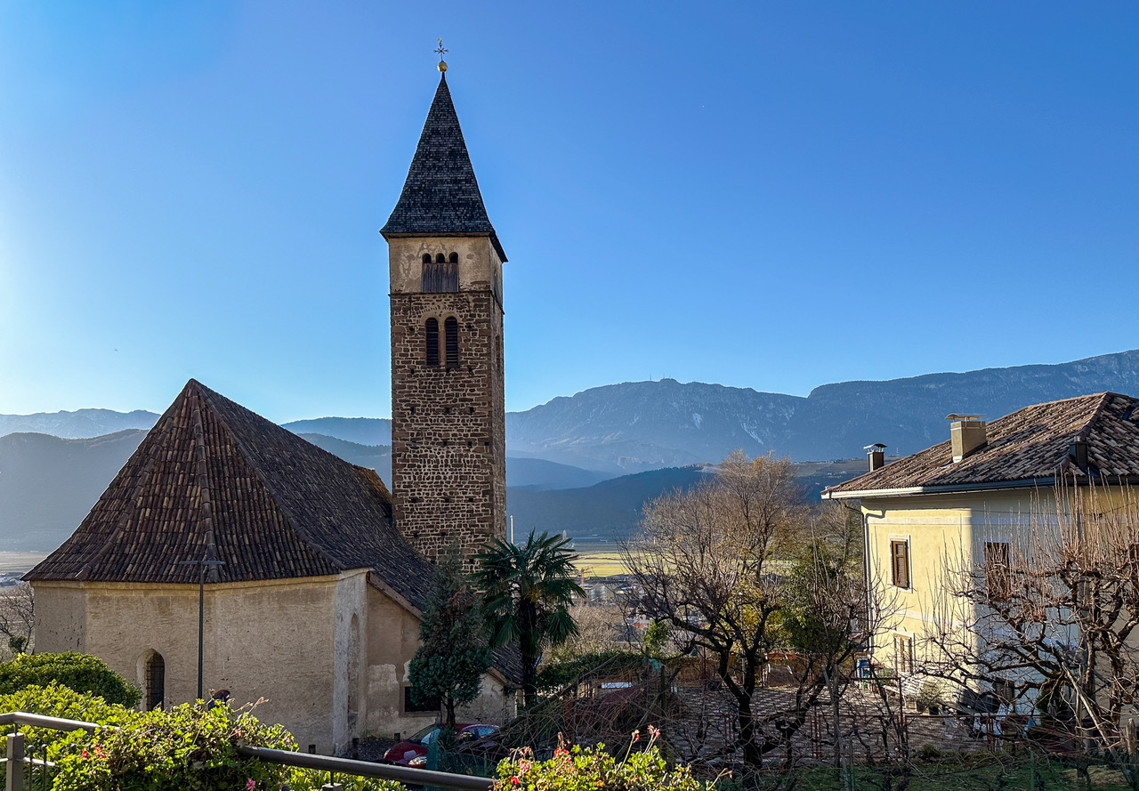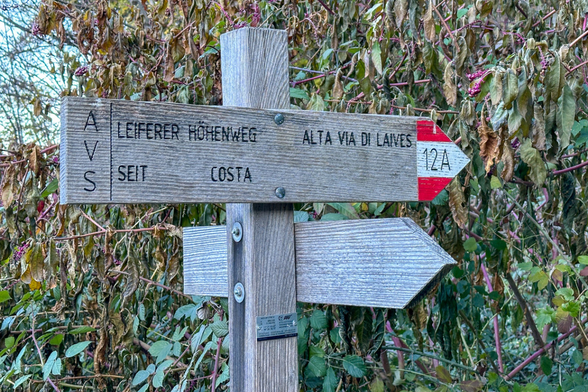 Der Rechtebner liegt auf einer weiten und -wie der Name sagt- ebenen Geländeterrasse mit Spielplatz und Tennisplätzen, in der warmen Jahreszeit ist hier viel Betrieb. Es geht nun etwas zahmer weiter, beim Fritscher -schade, hier war einst ein beliebtes Ausflugsgasthaus- treffen wir auf die Asphaltstraße, wir folgen nicht dem Leiferer Höhenweg, sondern machen wir einen kurzen Abstecher zum Kirchlein von Seit. Die Aussicht übers Etschtal ist prächtig. Dann wandern wir am Leiferer Höhenweg weiter.