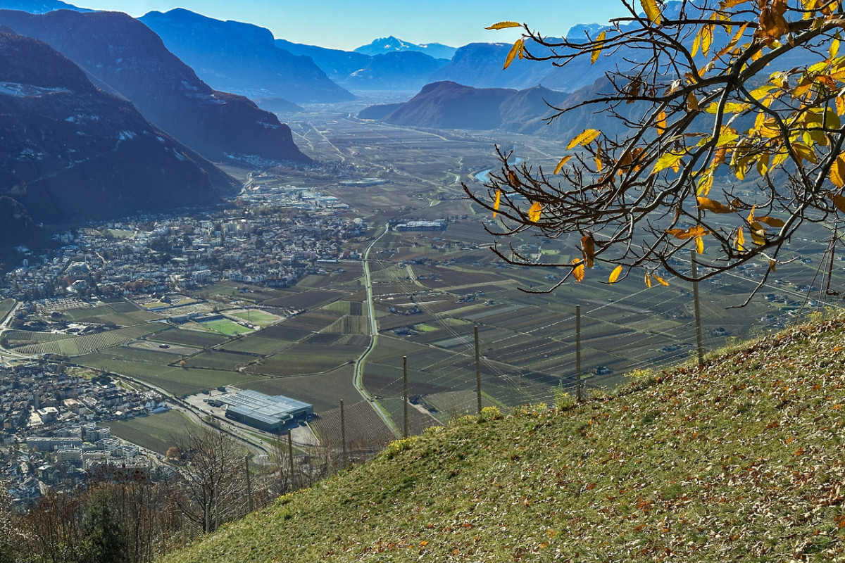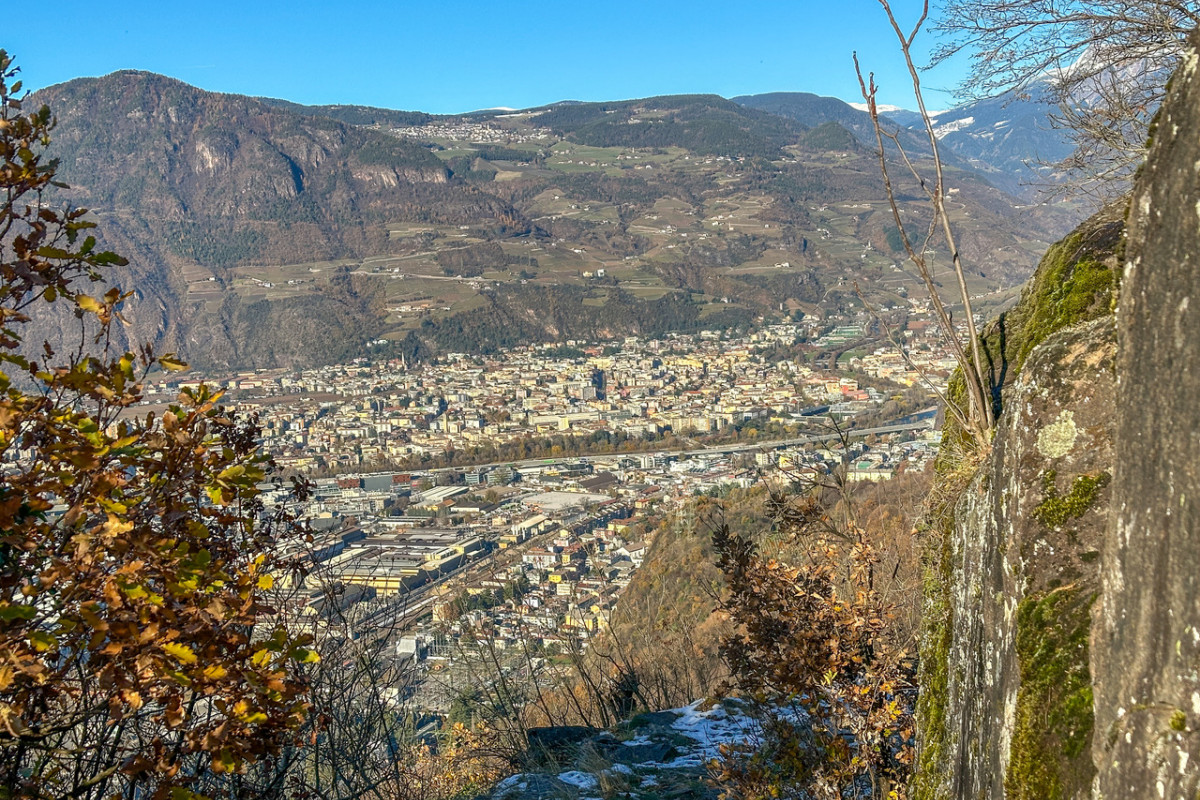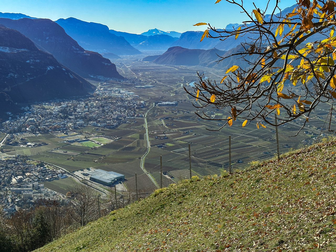 Nach einem kurzen Stück Asphalt biegen wir links zum Buschenschank Schluntner ab (Winterruhe), der auf einem Geländevorsprung liegt. Ich habe Glück und werde bewirtet, zur Mittagszeit werden Bauarbeiter verköstigt, es wird eine neue Wasserleitung gebaut, ich bekommen ebenfalls ein Arbeitermenü. Nach dem Schluntner geht der Karrenweg durch den Föhren- und Flaumeichenwald an Porphyrfelsen entlang, wird immer steiler, ist nun gepflastert und führt bis zu einer Aussichtskanzel mit einer Kapelle und einer Ruhebank. Hier genießen wir die tolle Aussicht auf Bozen und das Etschtal von Meran bis ins Unterland.