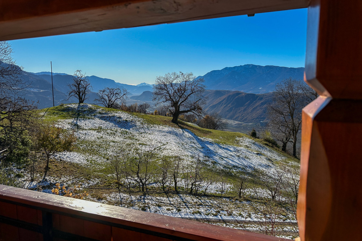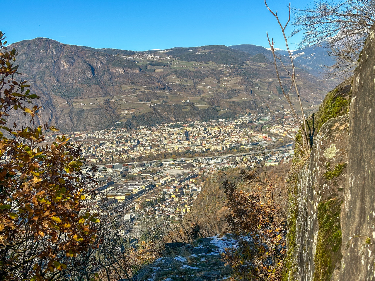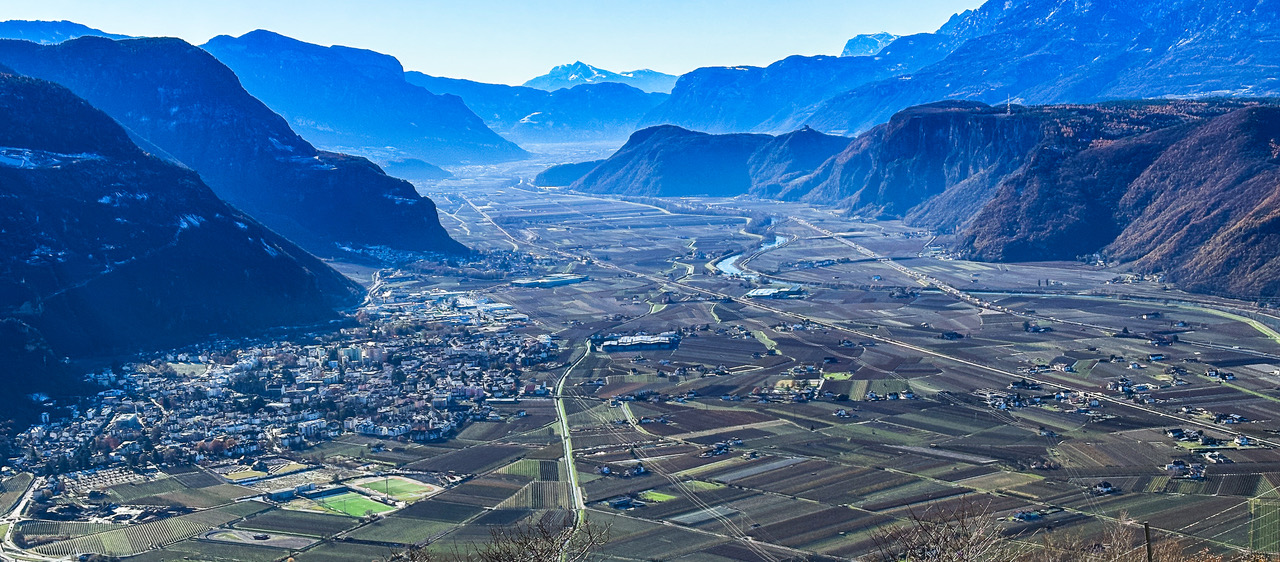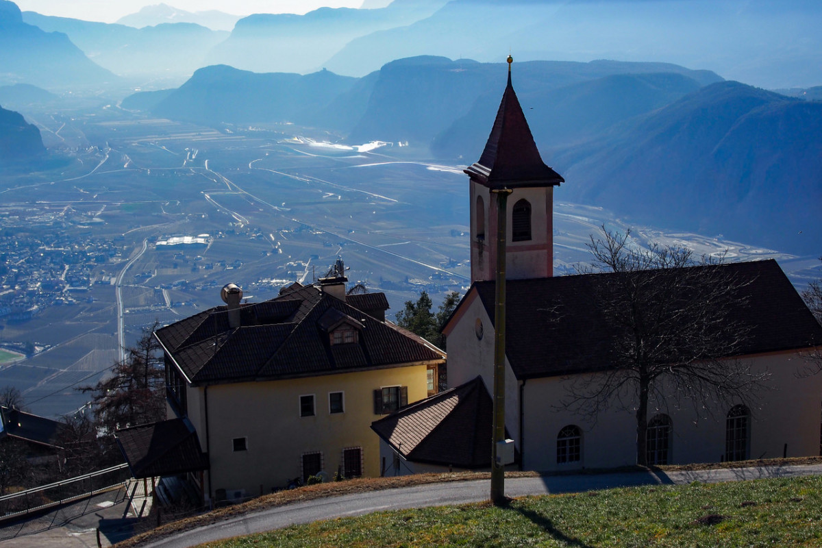 Nach einem kurzen Stück Asphalt biegen wir links zum Buschenschank Schluntner ab (Winterruhe), der auf einem Geländevorsprung liegt. Ich habe Glück und werde bewirtet, zur Mittagszeit werden Bauarbeiter verköstigt, es wird eine neue Wasserleitung gebaut, ich bekommen ebenfalls ein Arbeitermenü. Nach dem Schluntner geht der Karrenweg durch den Föhren- und Flaumeichenwald an Porphyrfelsen entlang, wird immer steiler, ist nun gepflastert und führt bis zu einer Aussichtskanzel mit einer Kapelle und einer Ruhebank. Hier genießen wir die tolle Aussicht auf Bozen und das Etschtal von Meran bis ins Unterland.