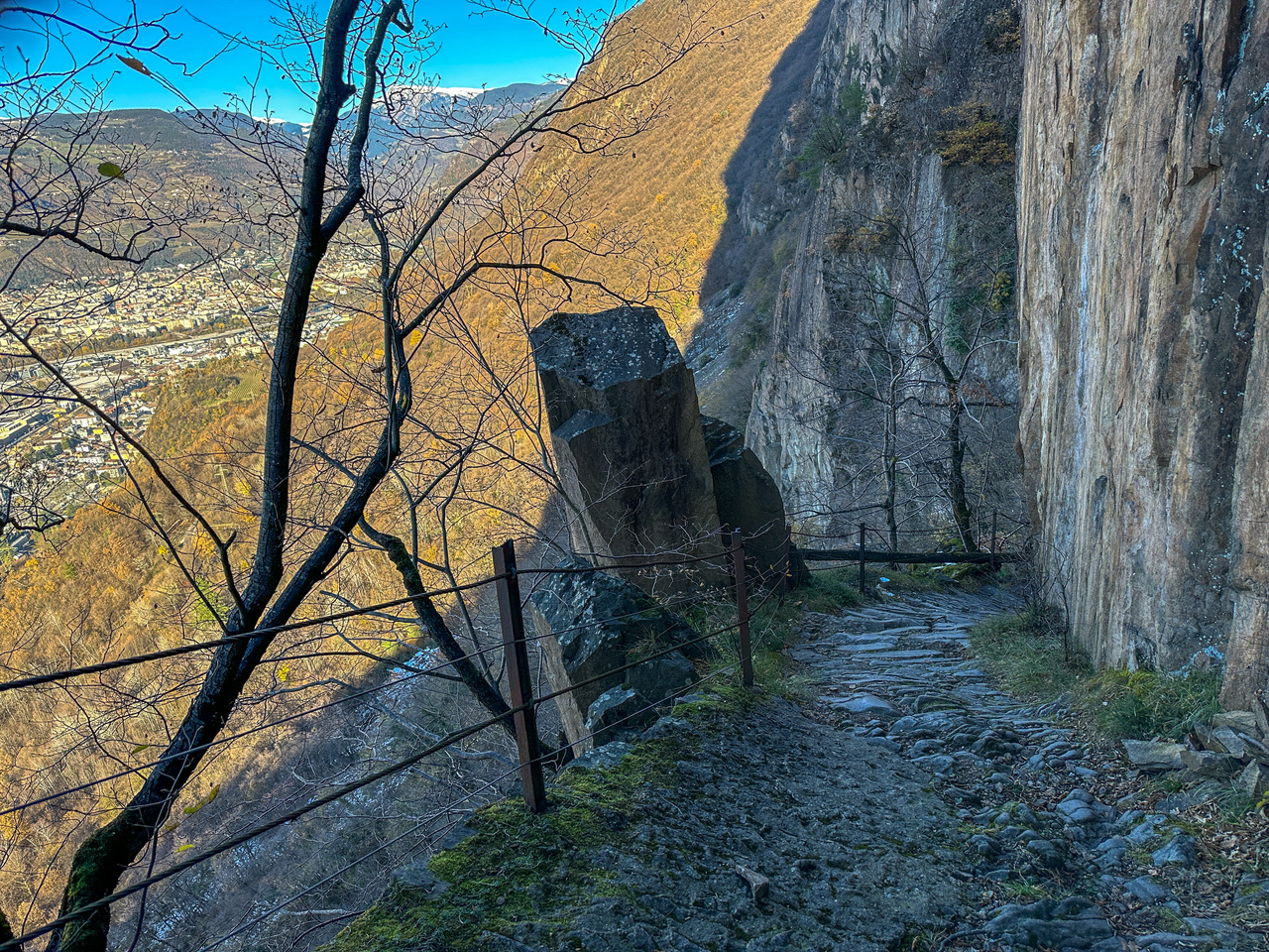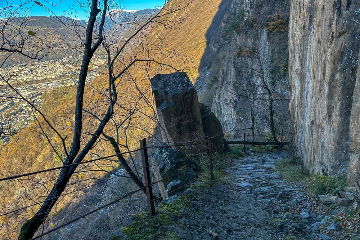 Der Weg ist zum schroff abfallenden Tal hin mit einem Geländer und streckenweise einem Stahlseil gesichert, kaum vorstellbar, dass dies der einzige Weg der Bauern aus dem Dorf Seit in die Stadt Bozen war. Ich höre Steinschlag, schaue nach und entdecke eine Gemse in den Felsen. Bevor ich ein Foto machen kann, ist sie schon wieder weg! Bei einer Wegkreuzung beim Antoniusbildstock (473 m) biegen wir links ab, geradeaus ginge es zur Haselburg und zum Bozner Stadtteil Haslach.