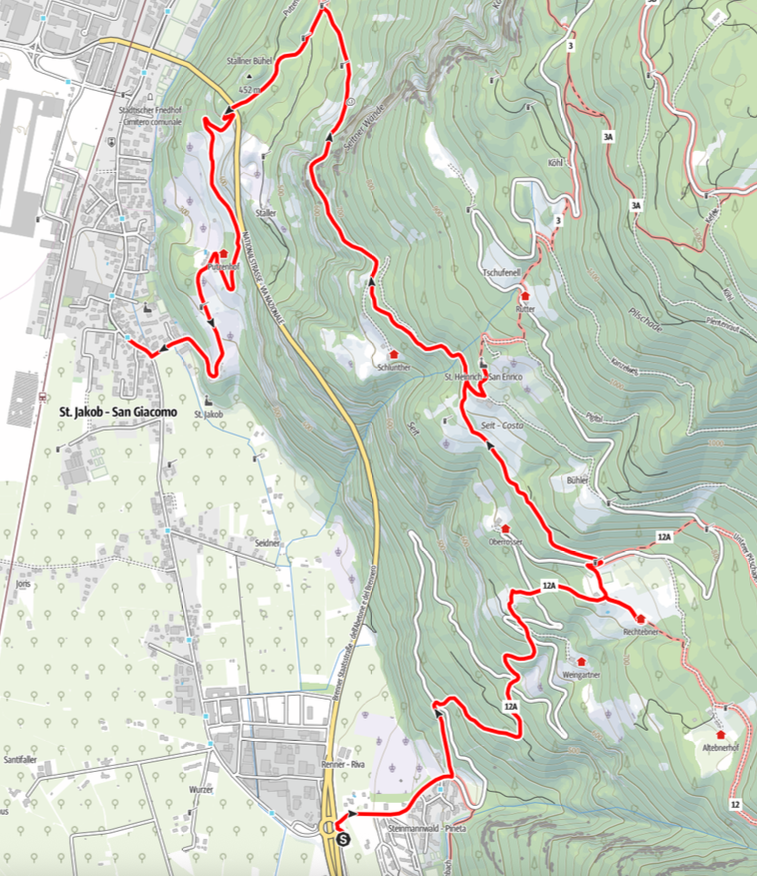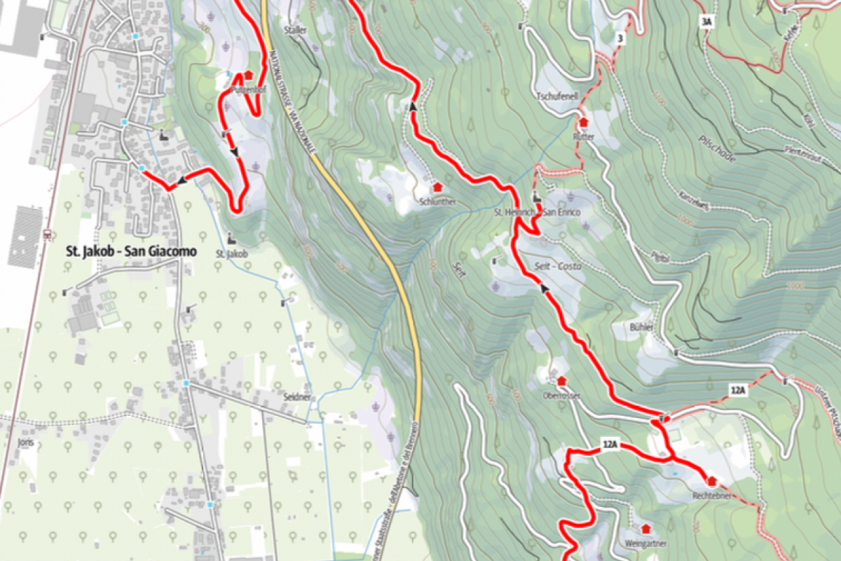 Öffis: Am besten ab Bozen mit dem öffentlichen Bus 110 oder 111, Haltestelle Abzweigung Seit. Rückfahrt ab St. Jakob mit denselben Linien. Fahrplan unter suedtiromobil.info -