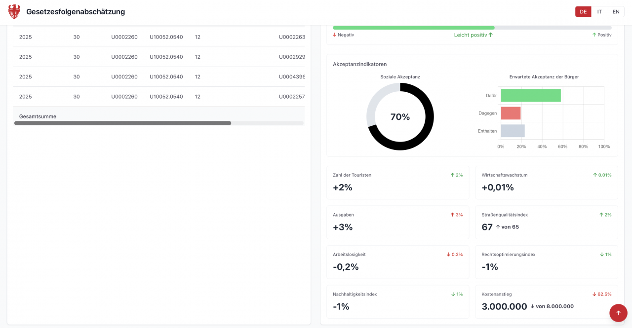 Ein Zauberstab ist die KI-basierte Gesetzesfolgenabschätzung allerdings nicht. Das dürfte vor allem an der Bewertung der sozialen Akzeptanz von gesetzlichen Bestimmungen liegen: Hier werden repräsentative Umfragen von Statistikinstituten wie ASTAT oder ISTAT genutzt. Theoretisch wären auch die Daten der Nutzerinnen und Nutzer von sozialen Medien wie Facebook, Instagram oder TikTok eine Hilfe.