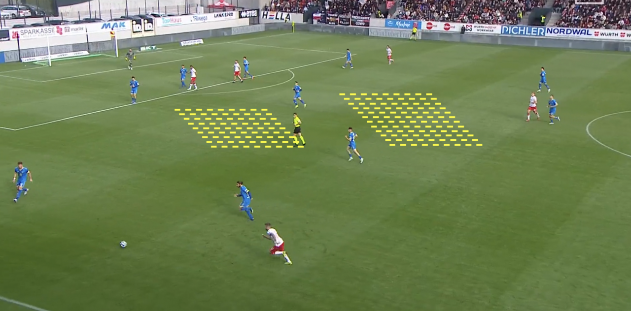 Wir kennen das inzwischen vom FCS unter Fabrizio Castori: Manndeckung über das gesamte (fast) Feld, meistens leiten Odogwu und Merkaj den Gegner auf deren linke Seite, wo dann die Seitenauslinie als natürliche Spielfeldbegrenzung die gegnerische Mannschaft zusätzlich unter Druck bringen soll.