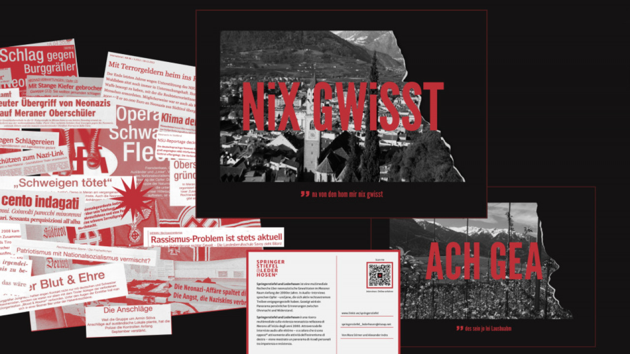Allargando lo sguardo oltre il capoluogo va evidenziato come nei primi anni Duemila l’ombra della violenza nera avesse trovato terreno fertile anche nel Burgraviato. Proprio quel periodo è al centro di Springerstiefel und Lederhosen, opera multimediale realizzata nel 2023 da Mara Stirner e Alexander Indra. Attraverso testi, fotografie, suoni e video, i due autori ricostruiscono una stagione segnata da botte, intimidazioni, paura e resistenze, articolando il racconto in quattro capitoli: Violenza, Strutture, Conseguenze e Resistenza. A emergere è il ritratto di un territorio attraversato da una tensione costante in cui punk, skater e giovani “alternativi” erano il bersaglio della violenza naziskin. “Non si trattava di risse – racconta una delle persone intervistate – ma di episodi organizzati. Cercavano di costruire strutture di destra ed entrare in conflitto con i gruppi alternativi che esistevano, occupare e conquistare gli spazi”.