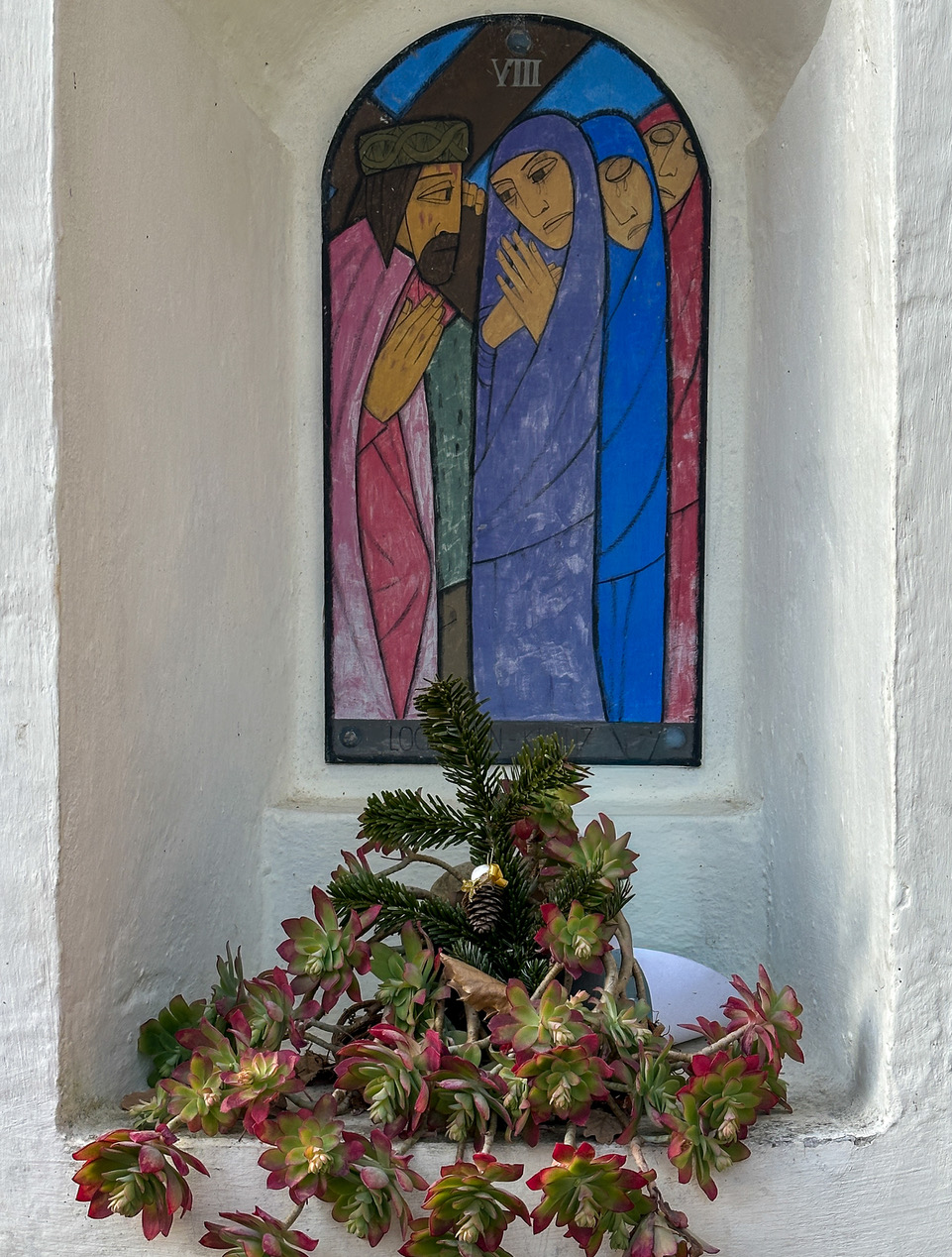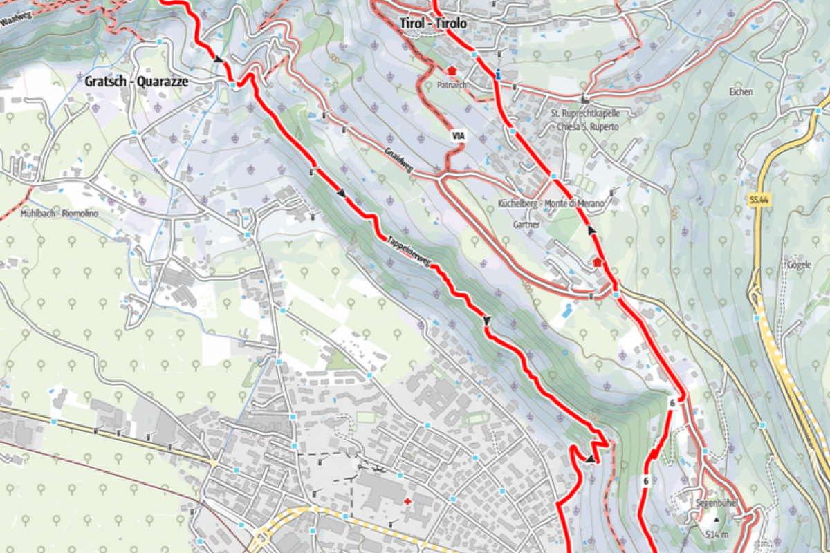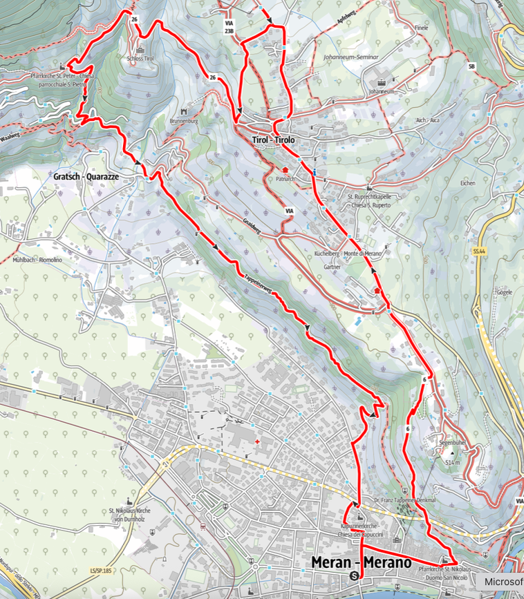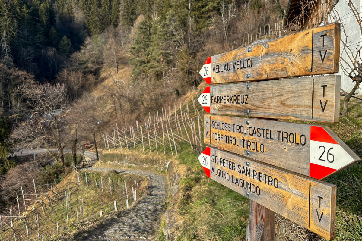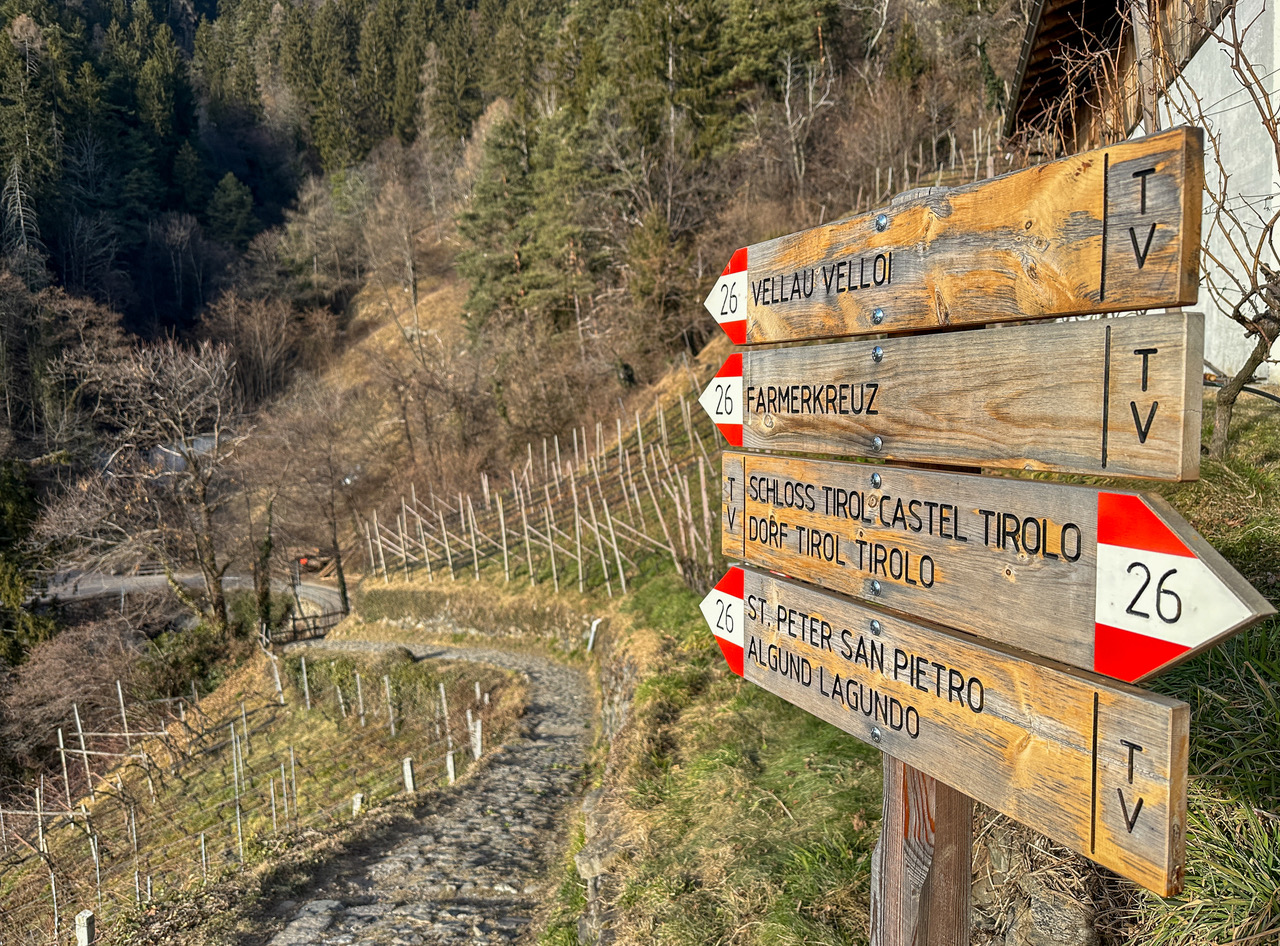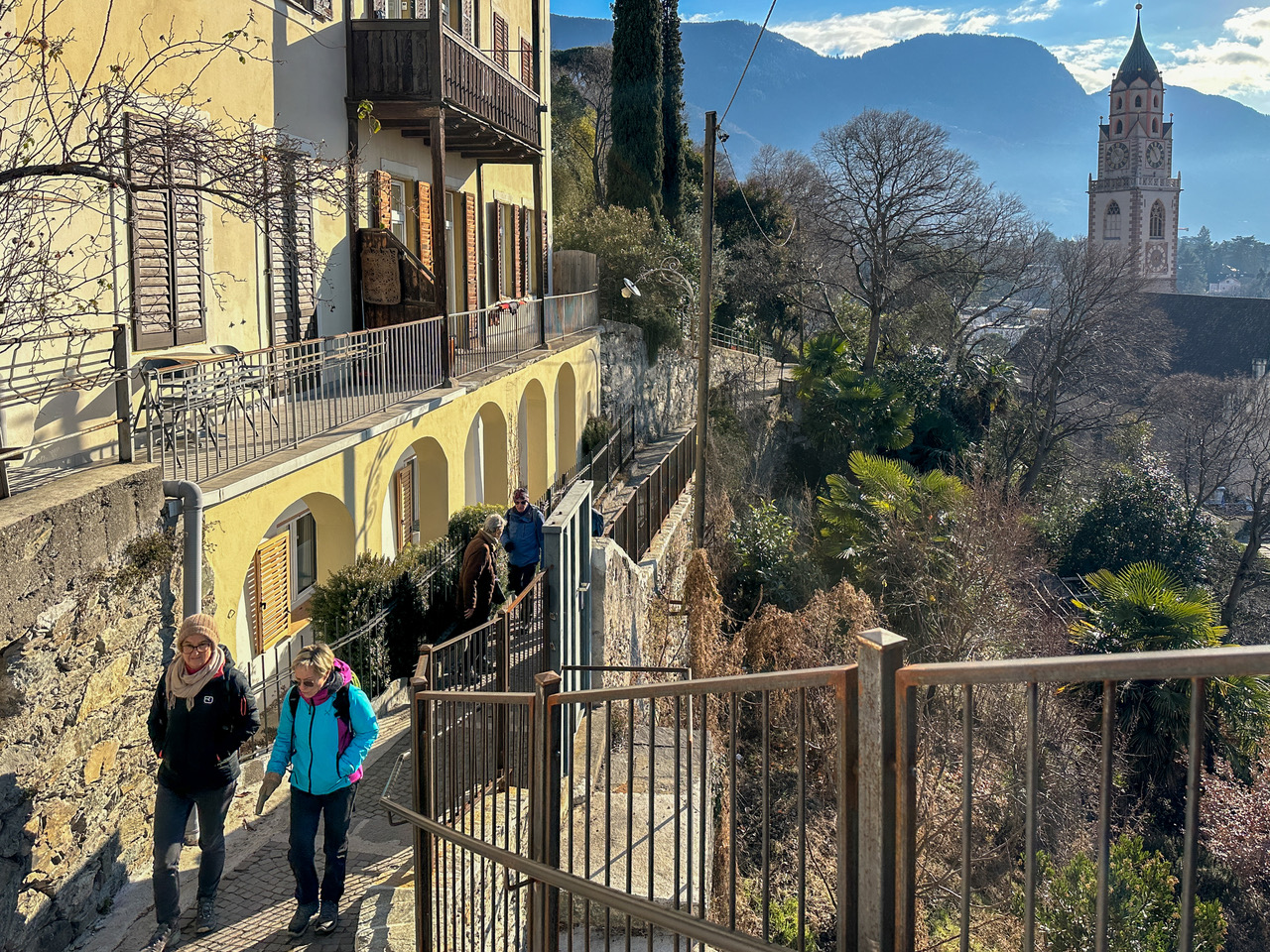 Wir starten vom Stadtzentrum (wir sind am Theaterplatz losgewandert) und gehen durch die Lauben zur Nikolaus-Pfarrkirche am Pfarrplatz. Aufgepasst, wir dürfen den Kirchsteig nach Dorf Tirol nicht verpassen, dazu gehen wir ans Ostende der Kirche, zwischen dem Chor und der Barbara Kapelle beginnt der Aufstieg zum Tappeinerweg. Über Treppen und Rampen gewinnen wir rasche an Höhe, nach wenigen Minuten sind wir am Tappeinerweg angelangt, überqueren ihn und folgen den Wegweisern „Tirolersteig“ und später den Wegweisern nach Dorf Tirol bergauf. Nach einer knappen Stunde stoßen wir auf die Landesstraße nach Tirol und folgen ihr auf dem Gehsteig ins Dorf. Nach der Besichtigung der schönen Dorfkirche suchen wir einen Platz fürs Mittagessen.