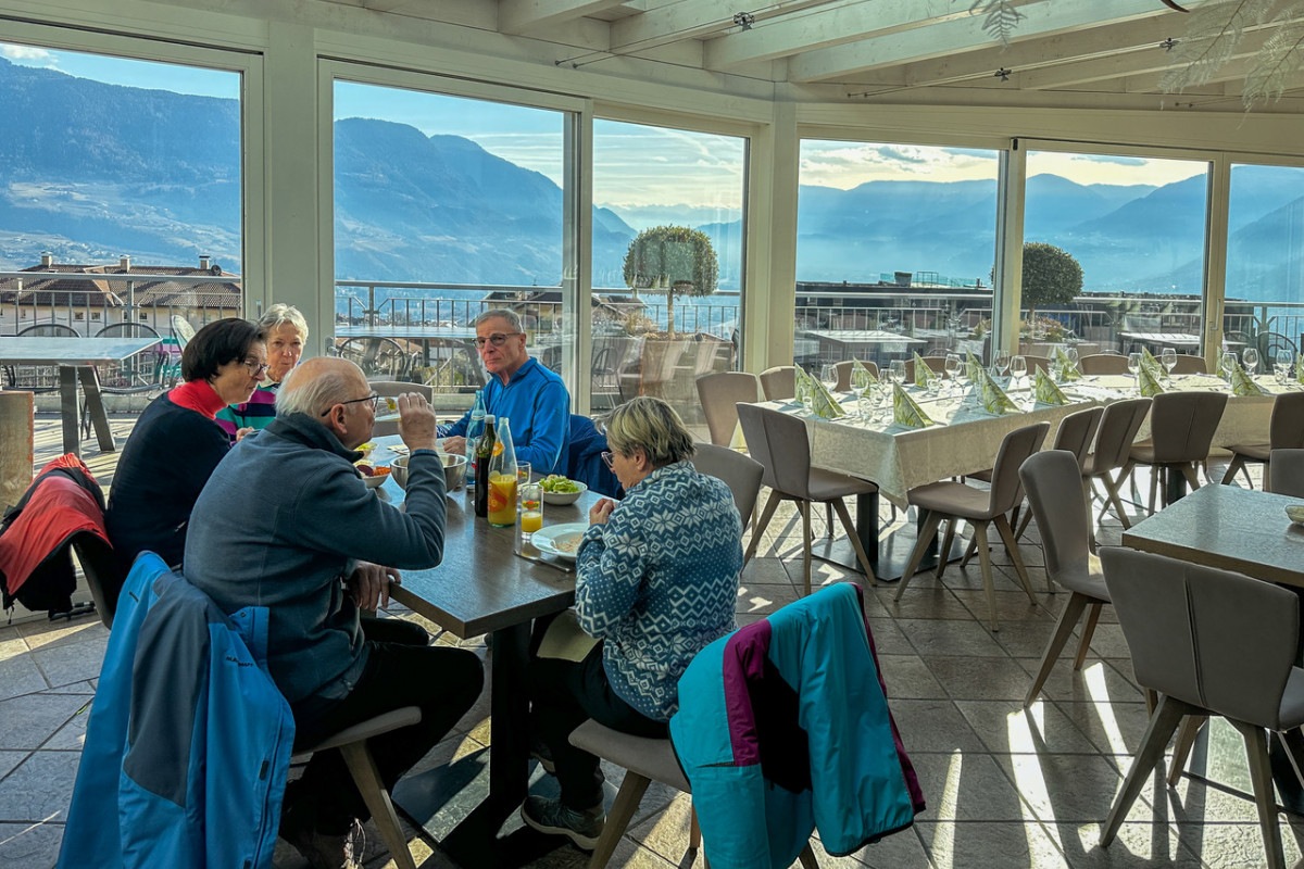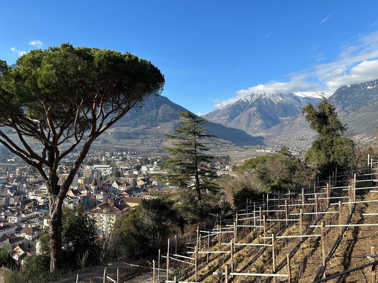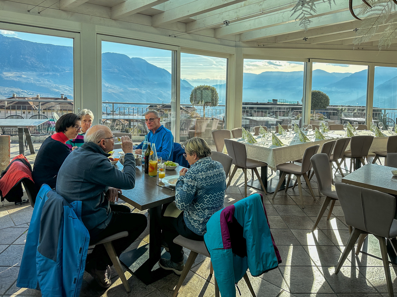Im Sommer hätten wir die Qual der Wahl, da lockt eine Vielzahl von Gasthäusern, Restaurants und Cafés, jetzt, außerhalb der Saison sind die Einkehrmöglichkeiten dünn gesät. Wir haben uns für das Restaurant an der Seilbahn Hochmuth entschieden, dazu müssen wir noch etwas aufsteigen, werden aber für diese kleine Zusatzmühe belohnt.Nach der Einkehr gehen wir unterhalb der Seilbahn in den Lutzweg, am Hotel Patrizia vorbei zum Garni Lutzhof, dort beginnt der Apfelweg, ein Themenweg, der uns bergab mit herrlichem Ausblick zu Schloss Tirol, das Meraner Becken und das Etschtal bringt. An einer Wegteilung halten wir uns rechts links geht es ins Dorf) wir stoßen auf den Schlossweg und folgen ihm nach Schloss Tirol.