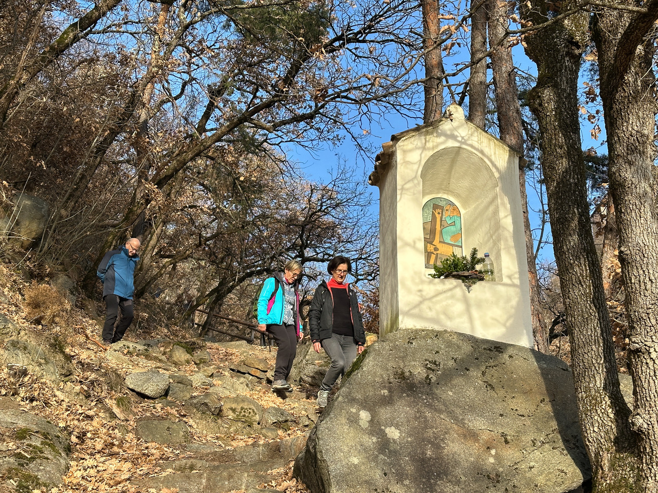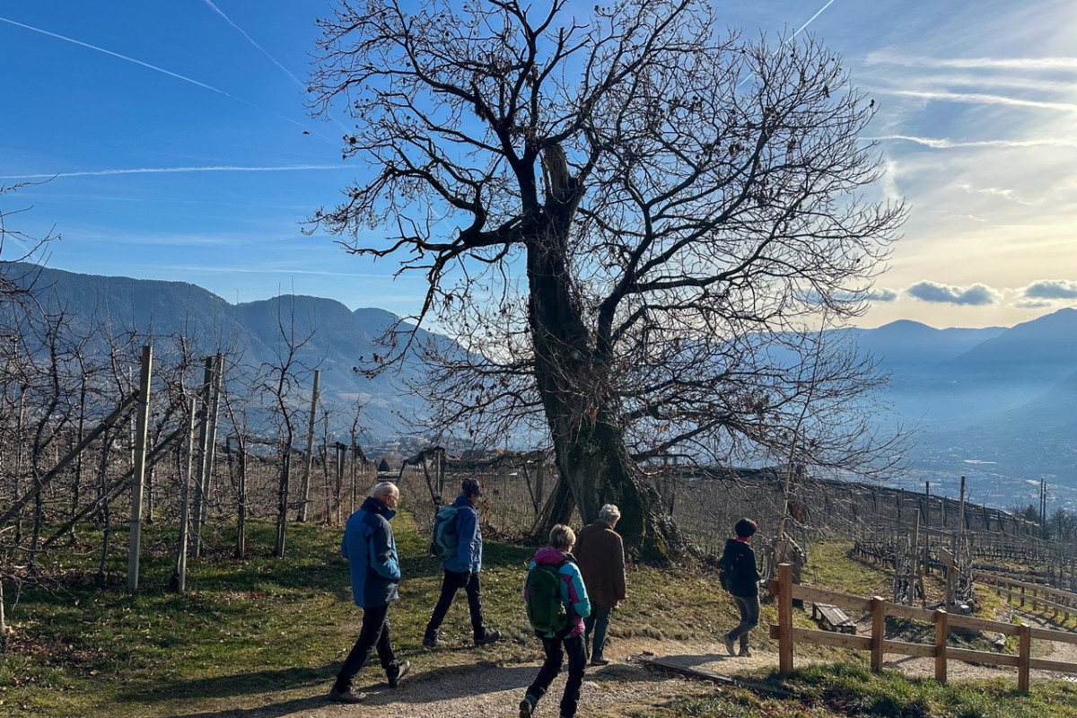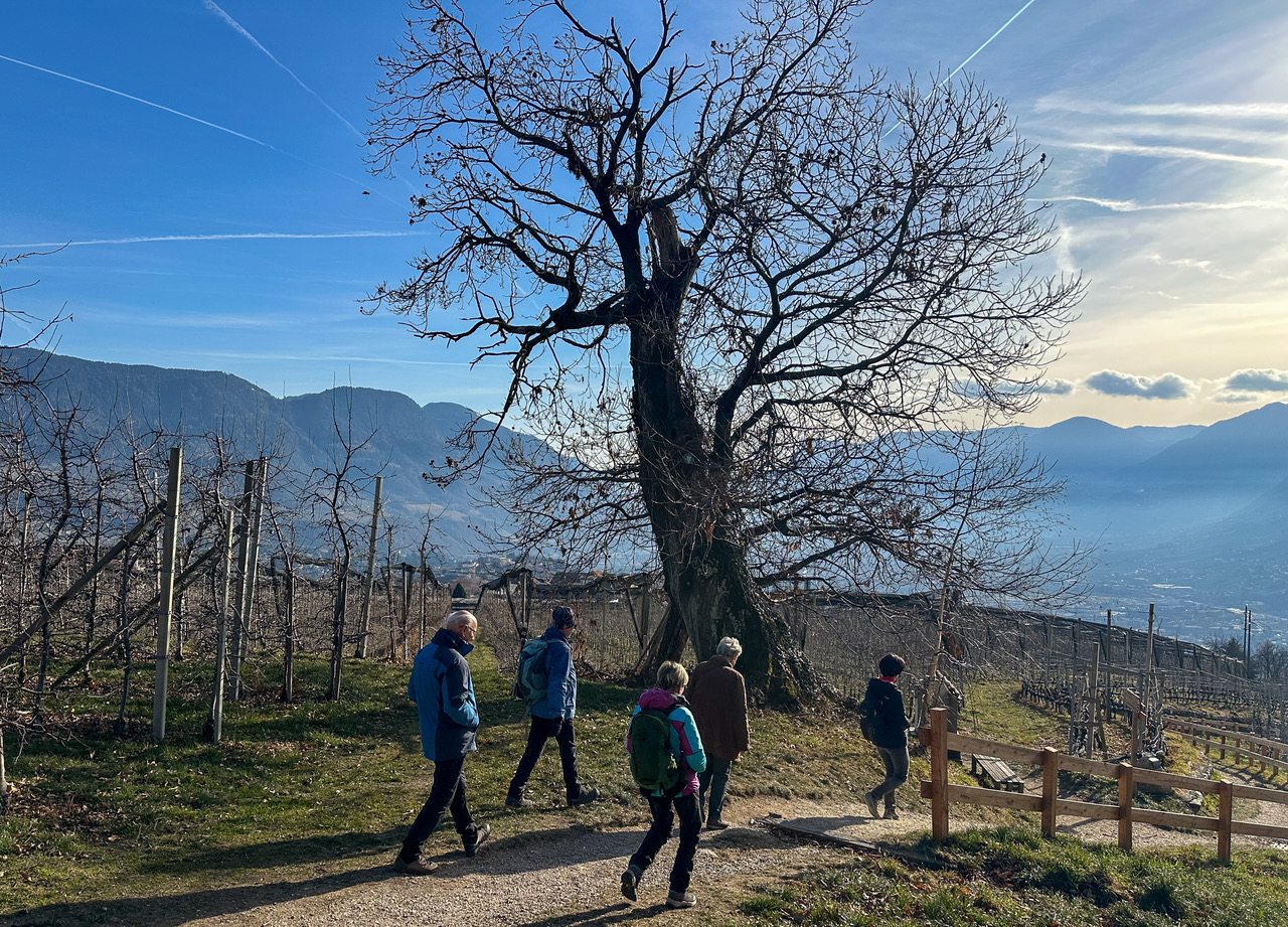 Am alten Kreuzweg stehen gemauerte kleine Kreuzwegkapellen, die von verschiedenen Bauern gestiftet wurden, die Bilder stammen vom bekannten Maler Peter Fellin. Wir überqueren eine Asphaltstraße und stoßen auf den Algunder Waalweg. Wir folgen ihm links und überqueren auf der Hängebrücke einen Bachgraben. Hier endet der Algunder Waalweg. Wir folgen die Asphaltstraße wenige Gehminuten bergab, bis links der Tappeinerweg und damit unser Rückweg nach Meran beginnt. In einer angenehm ebenen Wanderung queren wir jetzt den Hang des Küchelberges, mit schönster Aussicht über den Meraner Talkessel und zu den noch verschneiten Bergspitzen.