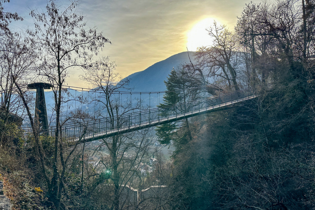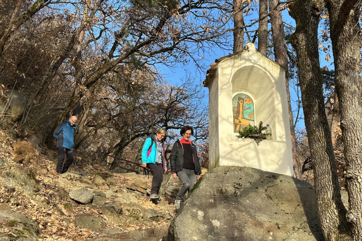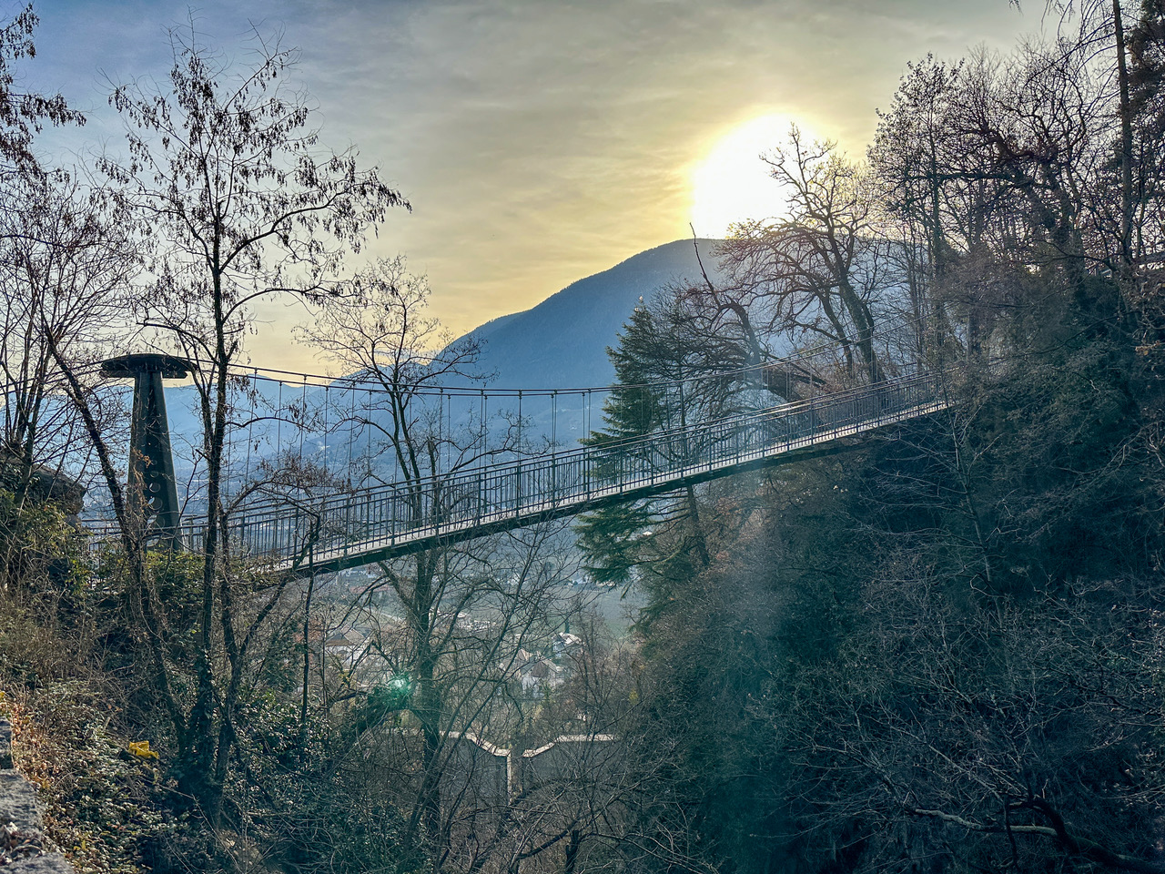 Am alten Kreuzweg stehen gemauerte kleine Kreuzwegkapellen, die von verschiedenen Bauern gestiftet wurden, die Bilder stammen vom bekannten Maler Peter Fellin. Wir überqueren eine Asphaltstraße und stoßen auf den Algunder Waalweg. Wir folgen ihm links und überqueren auf der Hängebrücke einen Bachgraben. Hier endet der Algunder Waalweg. Wir folgen die Asphaltstraße wenige Gehminuten bergab, bis links der Tappeinerweg und damit unser Rückweg nach Meran beginnt. In einer angenehm ebenen Wanderung queren wir jetzt den Hang des Küchelberges, mit schönster Aussicht über den Meraner Talkessel und zu den noch verschneiten Bergspitzen.