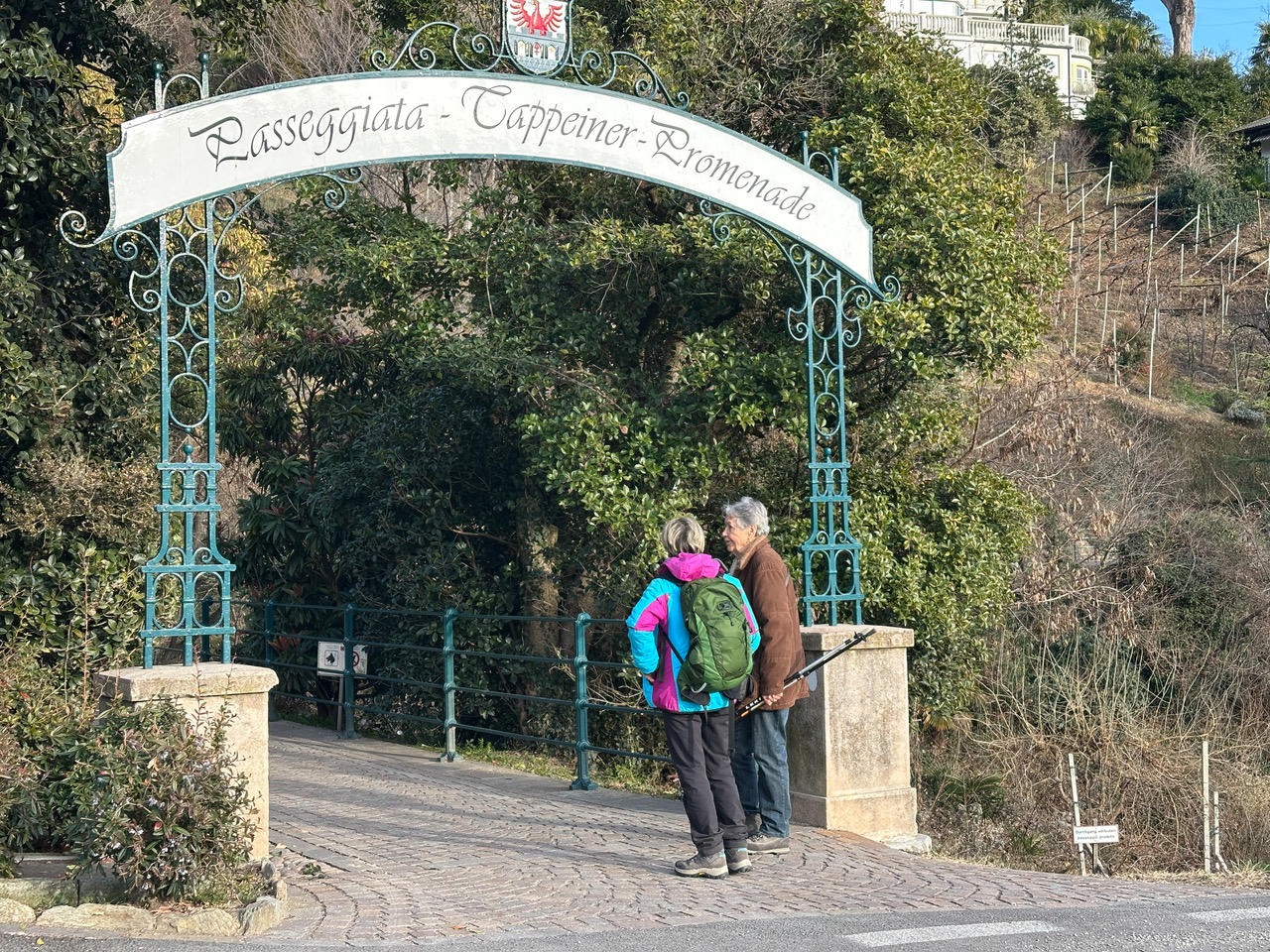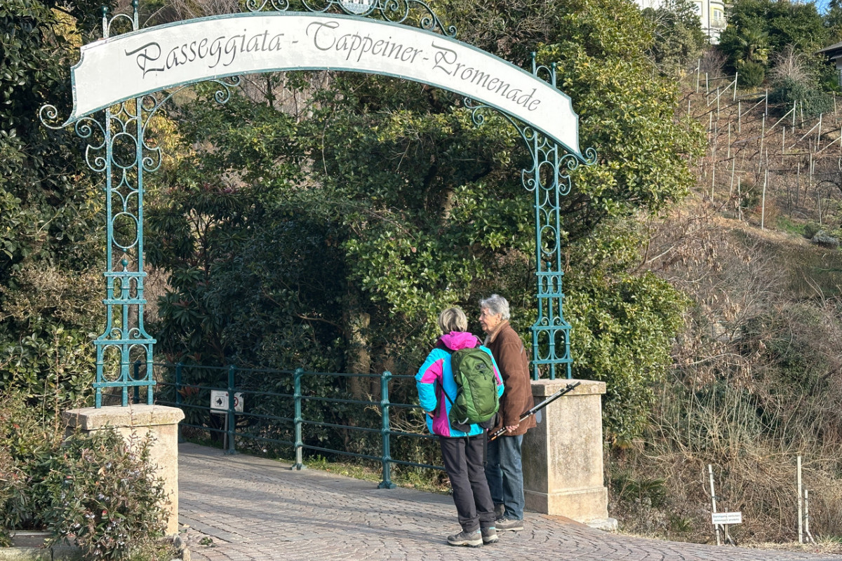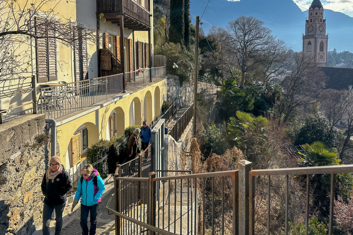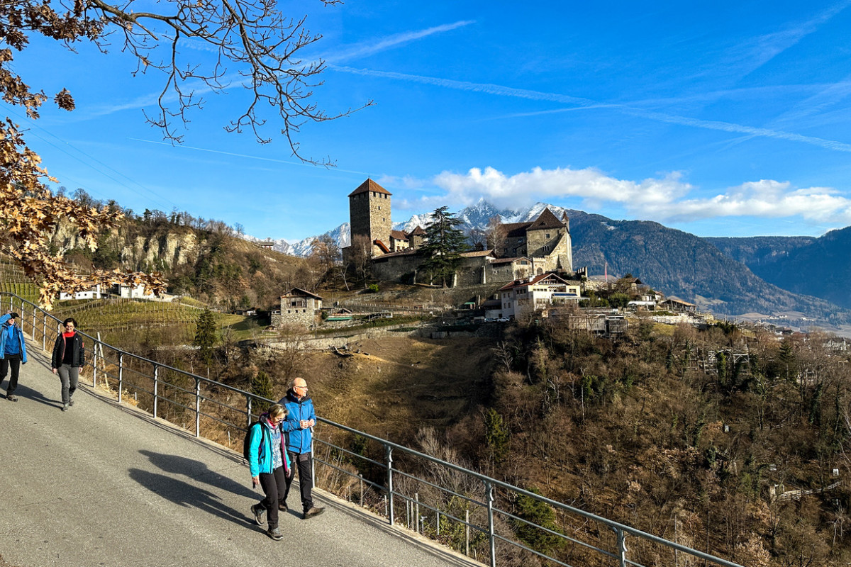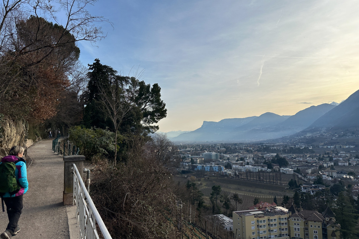 Die Einheimischen sind unter sich, vom großen Ansturm der Urlaubsgäste ist kaum etwas zu merken. Auf dem Rückweg wandern wir ein gutes Stück über den Tappeinerweg, er ist ohne Zweifel der berühmteste Spazierweg Merans und einer der schönsten weit und breit. „Über den Dächern“ der Altstadt bietet herrliche Ausblicke auf die Stadt, das Etschtal und zu den umliegenden Bergen. Wir kombinieren diese Promenade mit einer kleinen Wanderung nach Dorf und Schloss Tirol zu einem erlebnisreichen Rundweg.
